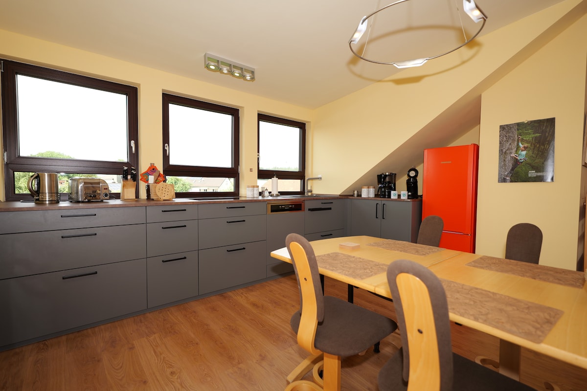 O espaçoso e acolhedor apartamento estúdio de 53 m² no último andar oferece espaço suficiente para até 5 pessoas. As várias opções de dormir incluem 1 cama de casal king-size para 2 pessoas, 1 cama de solteiro, 1 sofá-cama e 1 cama de hóspedes dobrável de alta qualidade. A pequena cozinha é adequada para preparar pequenas refeições. Para cozinhar, há uma placa de indução móvel com 2 bocas e um micro-ondas de 25 litros com função de grelha. O jardim está disponível para os hóspedes.