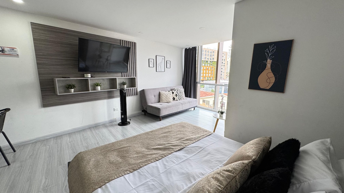 **Encantador apartamento estúdio na Armênia** Desfrute de uma estadia inesquecível no nosso apartamento com vista para a cordilheira, localizado no quarto andar. Localizado em uma excelente área da Armênia, você estará perto de parques, shoppings, clínicas, restaurantes e muito mais. Com fácil acesso ao transporte público, você pode chegar a destinos turísticos como Circasia, Salento e Filandia. O edifício oferece piscina, jacuzzi, sauna, bilhar e áreas sociais. Perfeito para a sua aventura no Eixo do Café!