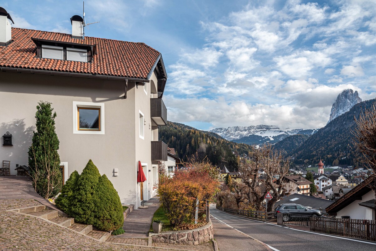 Helle Zweizimmerwohnung mit wunderschöner Aussicht auf den imposanten Langkofel, die Sellagruppe und die Cirspitzen, in sonniger Lage, abgelegen von allem Trubel; dennoch ist der Ortskern in nur wenigen Minuten erreichbar. Im Winter befindet sich die Skibushaltestelle nur wenige Meter entfernt und in kürzester Zeit sind Sie im Skikarussel. Kinder können frei herumtollen, da keine Straße am Haus vorbeiführt, im Gegenteil direkt vor der Haustür beginnt ein Wanderweg, die sog. "Via Crucis".