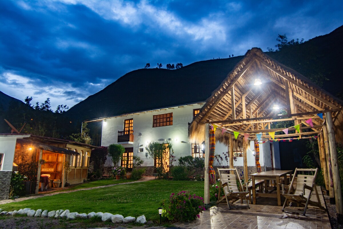 Estamos no Vale Sagrado dos Incas, estamos num lugar muito tranquilo, sem barulho de unidades de transporte, temos Wi-Fi de fibra óptica temos muita área verde, quartos confortáveis com casa de banho privativa, churrasqueira, área de estacionamento segura, cozinha grande, áreas abertas, área de fogueira