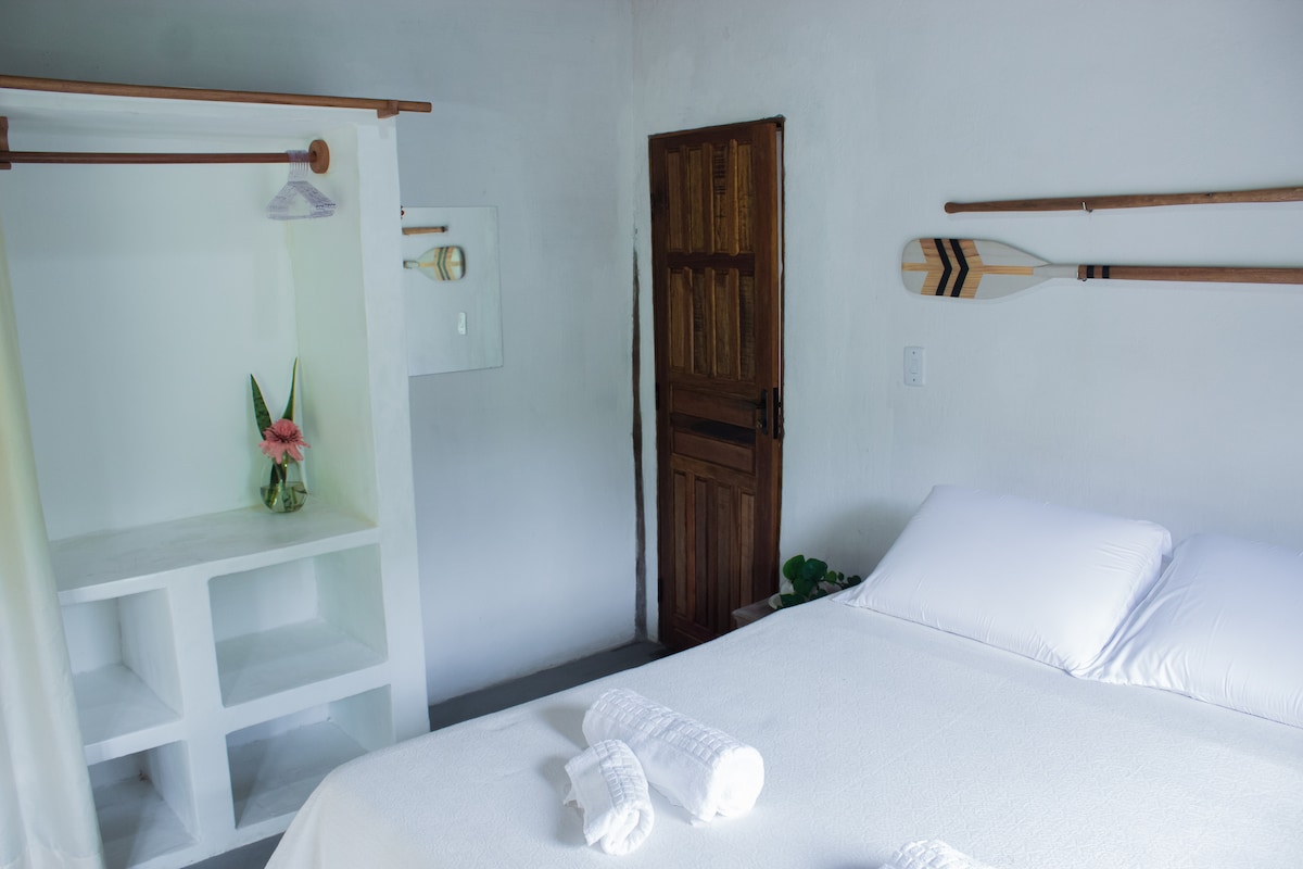 Chalé completo, possui uma cama queen. Podendo colocar um colchão de solteiro. Piscina privativa, cozinha bem equipada, banheiro com closet, ampla varanda com toda a privacidade e cercada de floresta com lindas flores e frutos. Aqui você estará em um refúgio, imerso na natureza e perto da vila e das praias de Serra Grande e próximo a Itacaré. ** Temos gatos e cachorros no sítio, qualquer questão enviar mensagem.