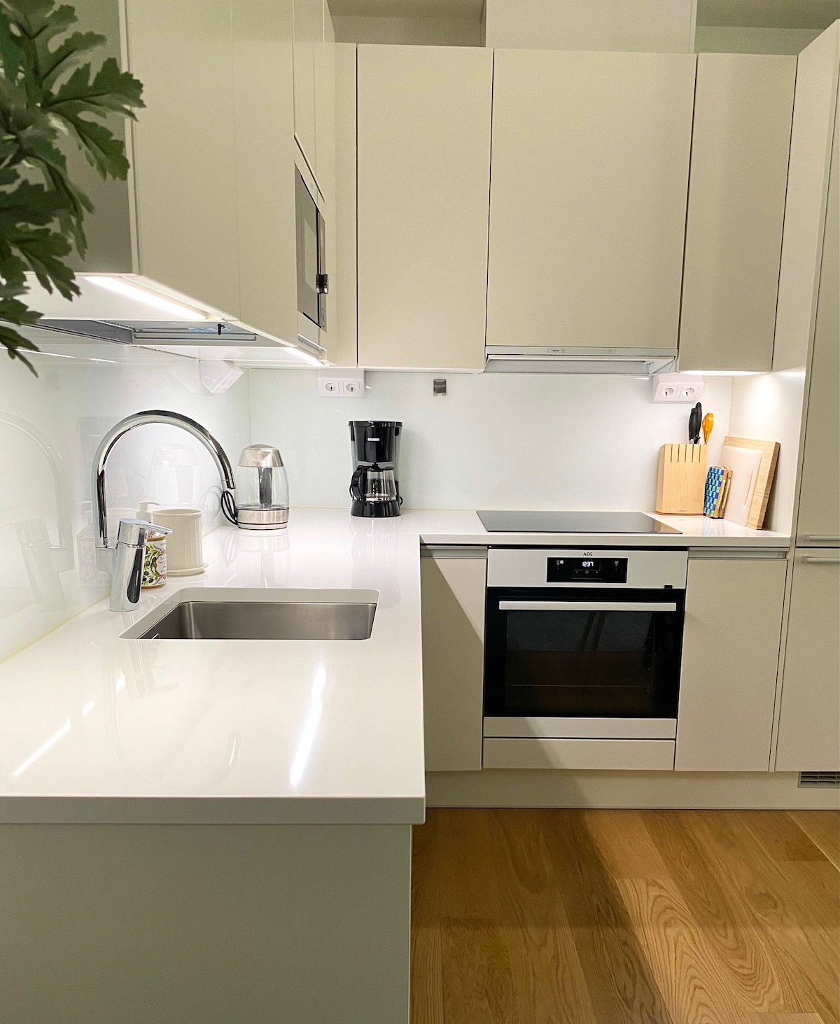 Um apartamento estúdio mobiliado com estilo escandinavo e uma cozinha de plano aberto totalmente equipada. Os apartamentos Scandi têm design leve e bastante luz natural. A Scandi oferece conforto e comodidade para o dia a dia. Tenha comodidades práticas, como uma cozinha totalmente equipada, máquina de lavar roupa, Wi-Fi rápido, suporte 24h e limpeza profissional regular, além de coisas divertidas, como uma smart TV. Fique em conforto pelo tempo que quiser – dias, semanas ou meses.