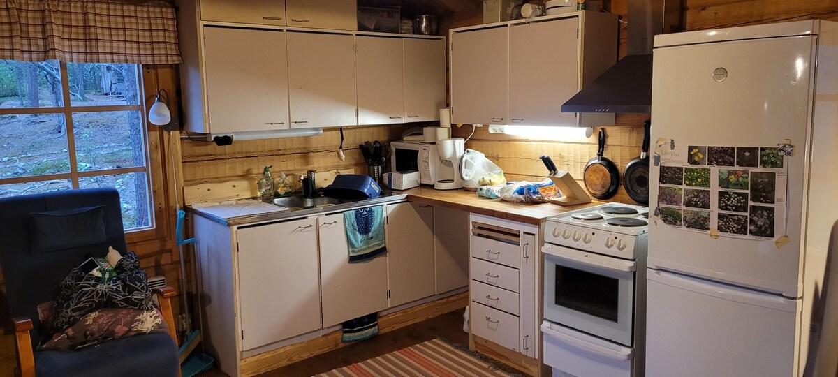 Casa de campo no meio da floresta, praia privada. Inari fica a cerca de 10 km de distância. A electricidade é, sem água da torneira. Um poço privado torna-se água fria para a sauna, onde pode obter água potável e água para lavar. A lavagem e a água da loiça têm de ser aquecidas. Sanita compostada no edifício do quintal. O hóspede deve ter experiência numa casa de campo onde não haja água da torneira ou uma casa de banho interior e deve saber como aquecer a sauna com árvores. Deve trazer os seus próprios lençóis e toalhas. Durante o verão, a utilização da sauna está incluída no aluguer, bem como um barco a remos. Indicações para chegar à propriedade.
