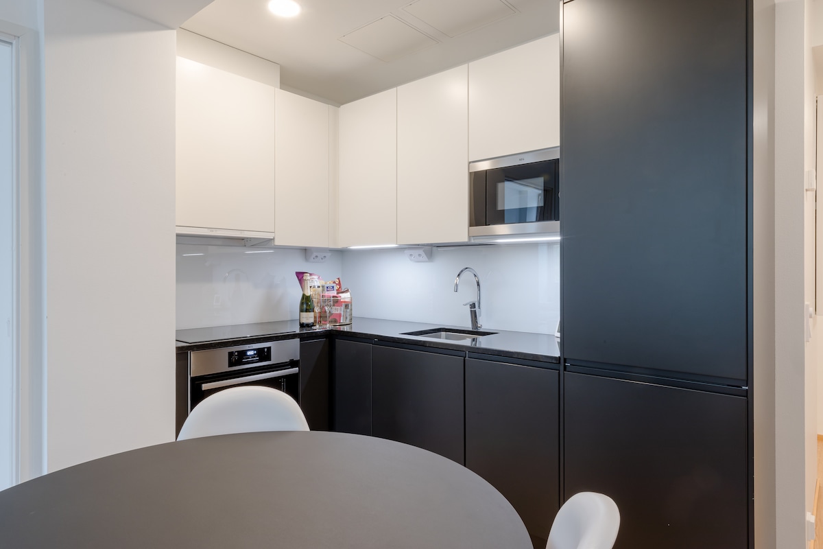 Um apartamento estúdio mobiliado com estilo escandinavo e uma cozinha de plano aberto totalmente equipada. Os apartamentos Scandi têm design leve e bastante luz natural. A Scandi oferece conforto e comodidade para o dia a dia. Tenha comodidades práticas, como uma cozinha totalmente equipada, máquina de lavar roupa, Wi-Fi rápido, suporte 24h e limpeza profissional regular, além de coisas divertidas, como uma smart TV. Fique em conforto pelo tempo que quiser – dias, semanas ou meses.