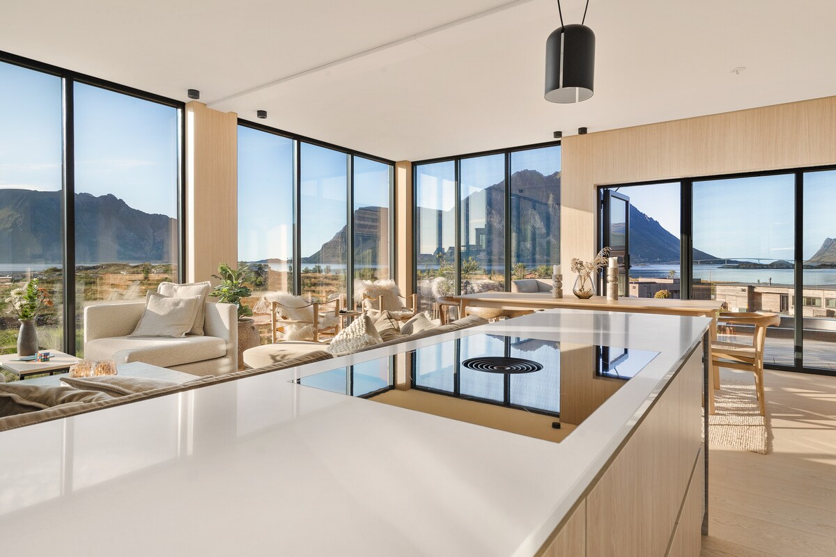 Aproveite sua estadia em Lofoten em uma cabana de pescadores com tudo o que você precisa. A cabana é nova, moderna e fica bem ao lado do oceano e das montanhas. A cabana está equipada com tudo o que você precisa, com uma grande cozinha totalmente equipada, quatro quartos, uma sala de estar com uma bela vista, 1,5 banheiros com chuveiro e máquina de lavar roupa, e uma sala de jantar com espaço para toda a família. Bela lareira na sala de estar no segundo andar.