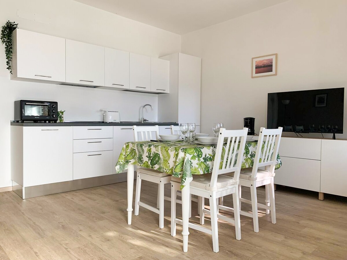 Divirta-se com toda a sua família ou amigos neste espaço elegante. O apartamento tem uma cozinha, 2 casas de banho, sala de estar, 2 varandas exteriores, 2 quartos (2 camas de casal completas) com a possibilidade de adicionar o 5º e 6º lugar graças a dois sofás-cama individuais localizados na espaçosa sala de estar. O apartamento também tem um berço adicional a ser solicitado no momento da reserva. Incluindo um lugar de estacionamento no piso térreo de frente para uma rua privada e videiras supervisionadas.