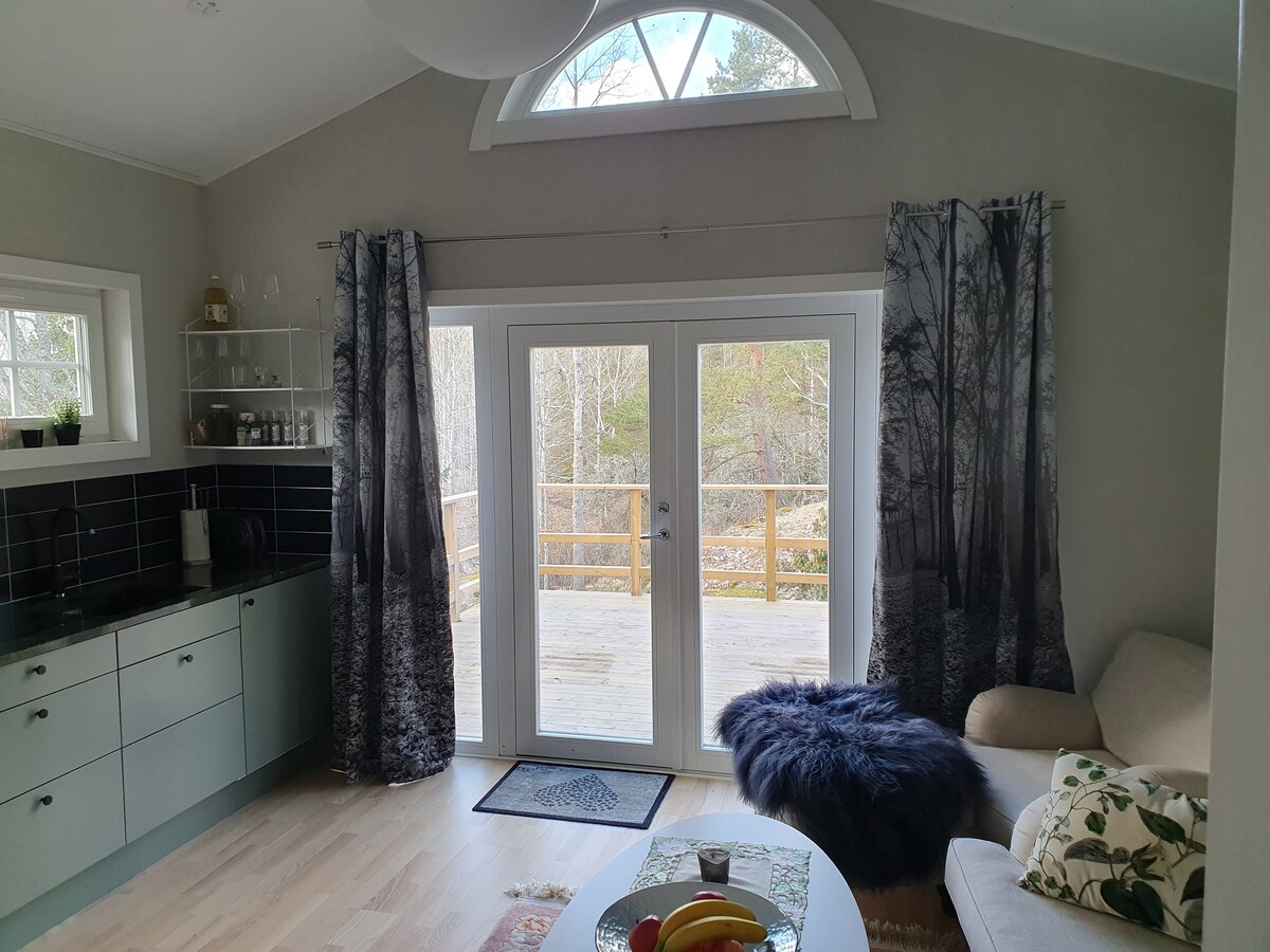 Faça uma pausa e relaxe neste oásis tranquilo. Aqui vive rodeado por floresta e natureza com uma vista fantástica para a água. Localizada em posição elevada com um caminho que leva a uma doca privada. Desfrute do sol da noite no cais, dê um mergulho ou porque não pescar? Casa de campo mais pequena na sua simplicidade, mas com todas as comodidades, como água, sanita, chuveiro, cozinha equipada, frigorífico e ar condicionado. Precisa de mais camas? Veja a outra cabana no mesmo lote, alugue-a ou ambas.