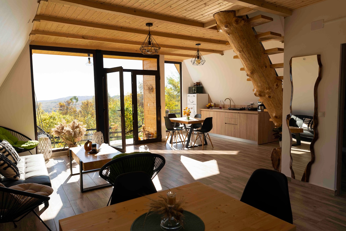 Relaxe neste alojamento único e tranquilo. Situado numa altura arborizada numa pequena aldeia típica do sopé dos Cárpatos, o chalé oferece uma vista esplêndida das colinas e da floresta circundantes. Irá desfrutar da tranquilidade do lugar para observar o cenário natural, o céu estrelado ou a vida selvagem local, como esquilos, veados ou pássaros. O chalé totalmente equipado oferece uma área de estar confortável e espaçosa com todas as comodidades necessárias