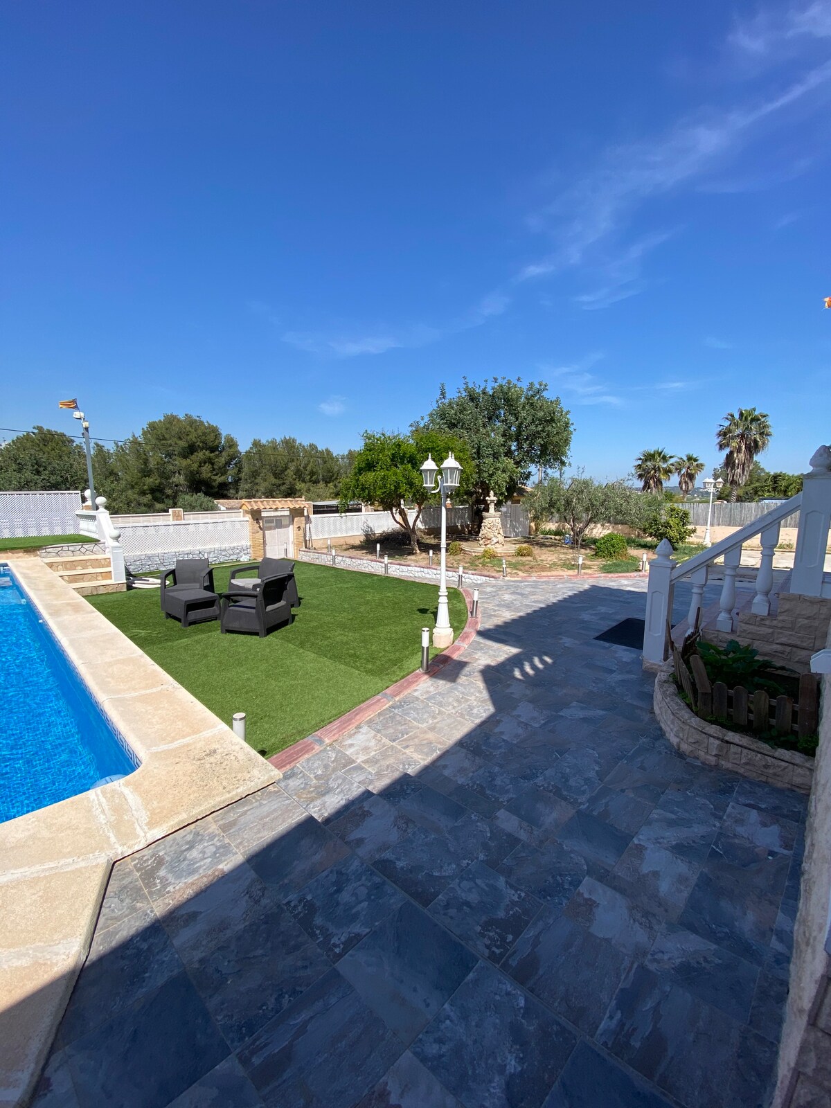 En este alojamiento se respira tranquilidad: ¡relájate con toda la familia! a solo 30 minutos de valencia, disponemos de chalet total renovado con todas las comodidades para una estancia agradable: -4 habitaciones /4 camas de matrimonio -3 sofás camas ubicados en el salón de juegos y gimnasio - amplio jardín cerrado para niños y mascotas. -piscina con baño exterior -2 cocinas totalmente equipadas -zona exterior cubierta para actividades -lavandería con lavadora, secadora y productos de limpieza