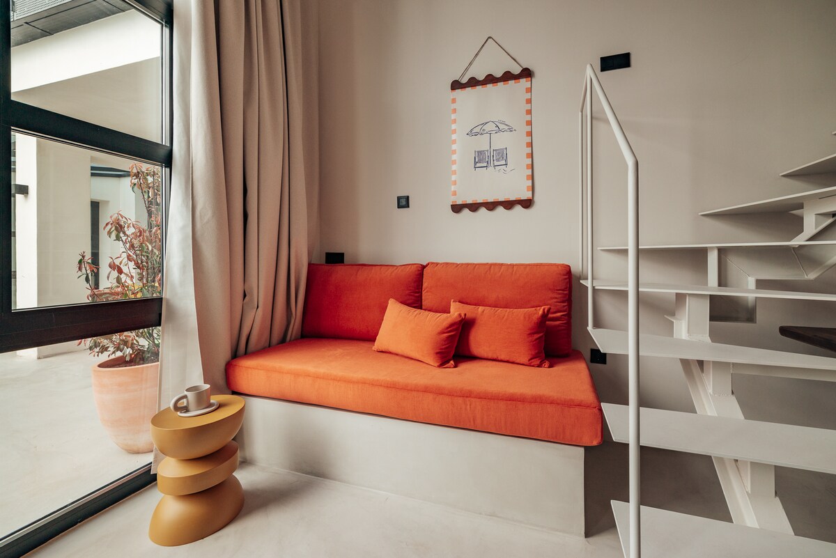 Duplex luminoso com acesso direto a partir do nosso encantador pátio, ideal para até 3 pessoas. Tem uma área de estar com um sofá, cama de casal e janelas grandes que fornecem luz natural. Há um único sofá-cama no andar de cima, ideal para uma pessoa. Cozinha equipada com placa de vitrocerâmica, micro-ondas, frigorífico e máquina de café Nespresso. Casa de banho com secador de cabelo, toalhas e produtos de higiene. Ar condicionado de alta velocidade e Internet. Perto do mar e da Cidade das Artes.