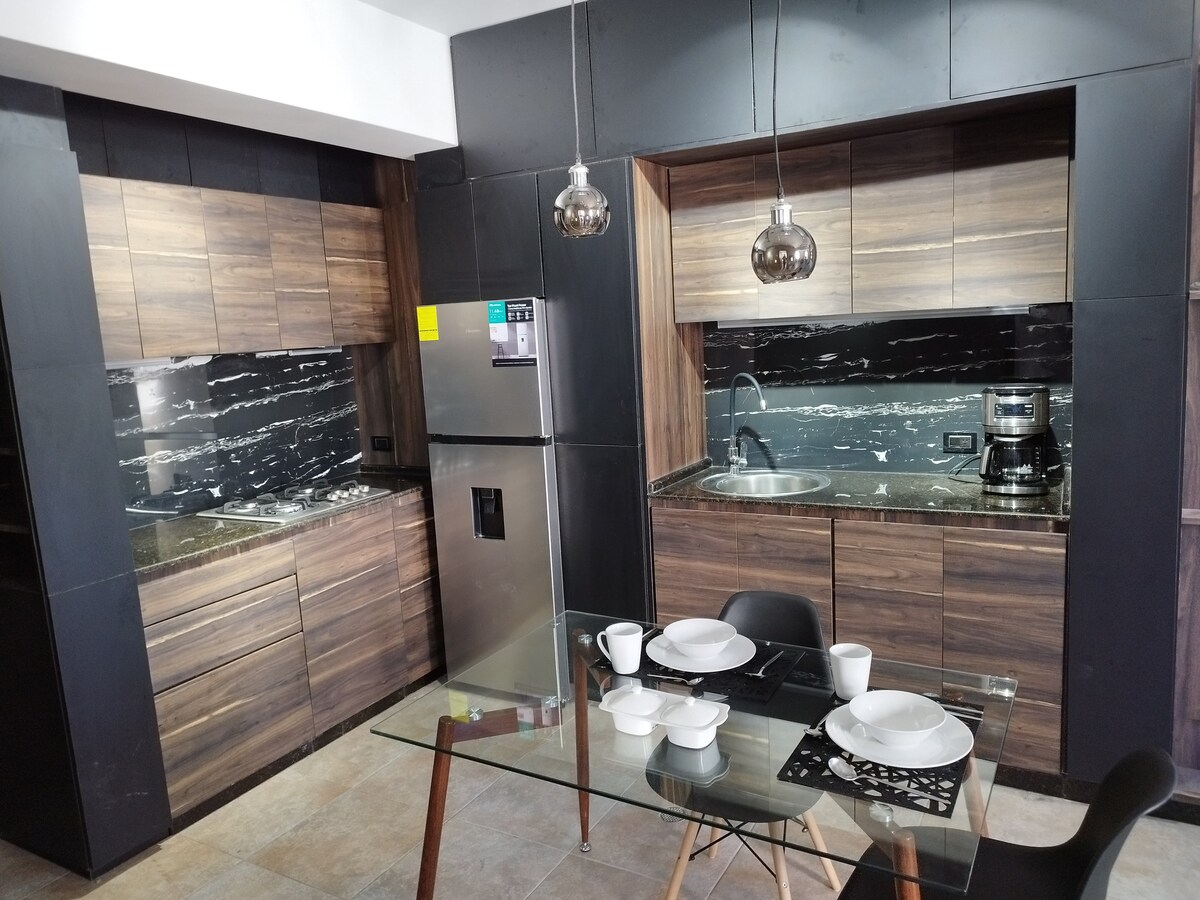Desfrute de uma experiência elegante neste alojamento central, com todas as vantagens de um hotel na privacidade de um apartamento. Decoração única com todas as comodidades e serviços. Ele é projetado para 1 a 3 pessoas, 1 quarto com uma cama queen size e 1 sofá-cama de casal na sala, com roupa de cama de algodão Banheiro com design espetacular, toalhas de alta qualidade. Cafeteira, liquidificador, forno de micro-ondas, talheres, louça, panelas, etc. Tanque de água Usina elétrica 50% Vigilância 24h