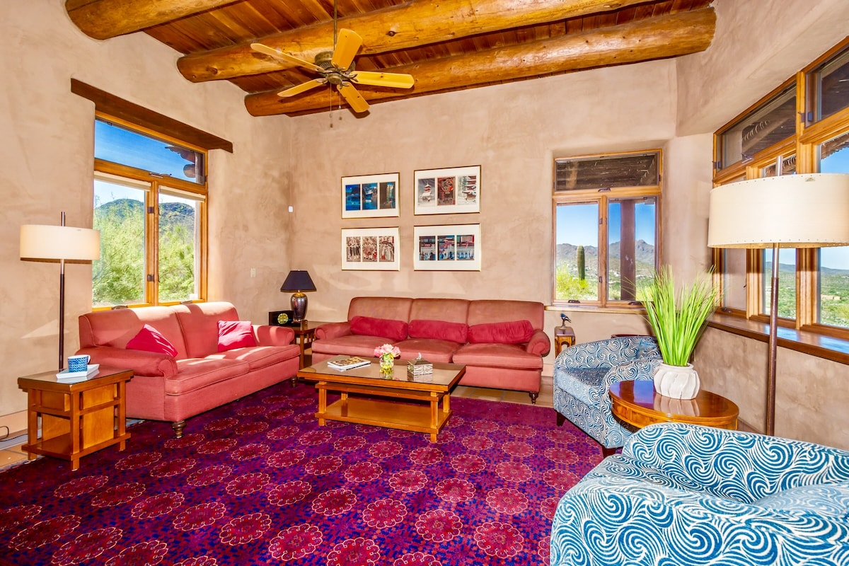Casa espaçosa e ensolarada na lateral do butte cercada por um lindo deserto de Sonora de 3,2 acres. Saia para um pátio privado para beber café de manhã ou jantar à noite, e tenha seus sentidos despertados para as vistas e sons de interesse e beleza do deserto. Toda a propriedade é sua para explorar e desfrutar, com um caminho de caminhada privado onde você pode caminhar até as alturas para uma vista de 160 quilômetros. A casa fica em terreno elevado e grandes janelas oferecem vistas de 360 graus. Inspire-se!