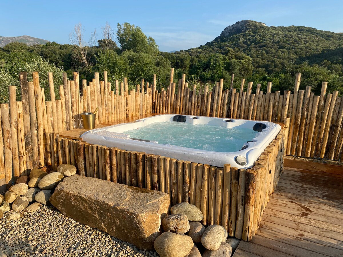 O acesso à nossa cabana Albitru é feito por uma pequena trilha que serpenteia no coração da nossa propriedade. Você entra em nossa cabana por uma passarela, o espaço de vida único se oferece a você. A vista do vale de Ampugnani até o mar é incrível. Você sobe então ao terraço, onde se sente em êxtase... O café da manhã é servido no horário de sua escolha e "U Rifugiu", nossa mesa de hóspedes, recebe você para o jantar.
