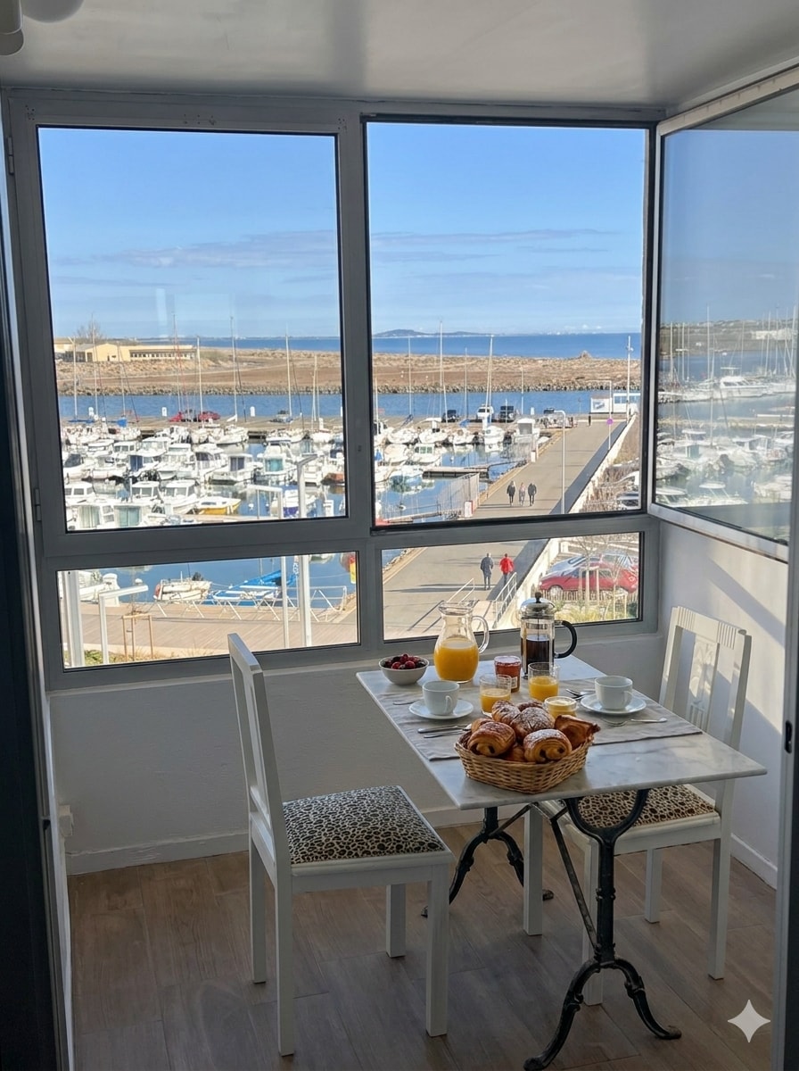 Alojamento classificado 3★ para 2 pessoas com 2 camas extra, ideal para até 4 pessoas. Estacionamento gratuito no fundo da residência (pago no verão) Praia, lojas, restaurantes a 2 minutos a pé. Não é necessário veículo. Acolhedor, com ar condicionado, totalmente equipado, confortável e recentemente renovado. Uma área de dormir acolhedora que combina conforto e privacidade. Roupa de cama/toalhas, gel de banho/champô fornecidos. Varanda com vista deslumbrante para a marina, para o mar e para a praia. Para umas férias perfeitas ou uma estadia relaxante.