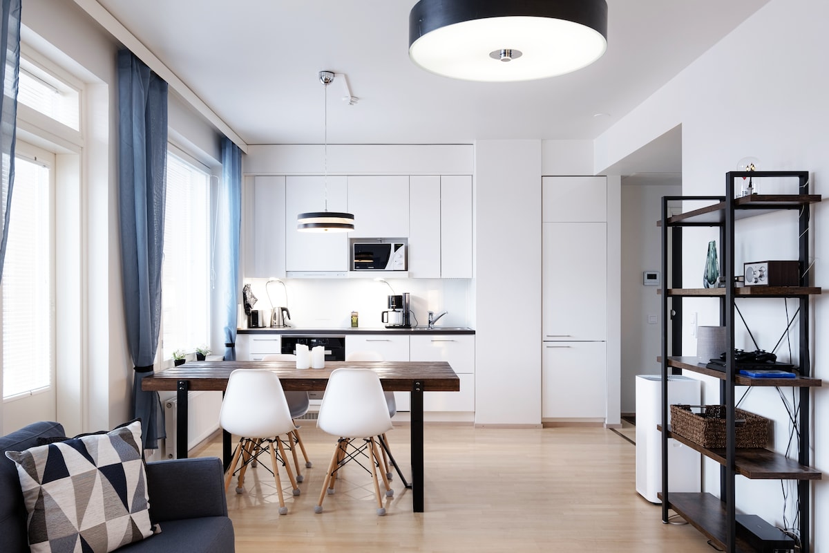 Apartamento de um quarto (45m2), totalmente mobiliado e equipado. Uma varanda e janelas para um pátio tranquilo. Sauna e pequena academia no prédio. 5-20 minutos a pé de todas as atrações do centro da cidade. A um quarteirão do shopping center Kamppi e da estação de metrô/ônibus. Espaço de estacionamento dedicado com carregador de veículos elétricos de 11kW disponível por uma taxa extra. O espaço está localizado em uma garagem aquecida diretamente acessível por um elevador do apartamento.