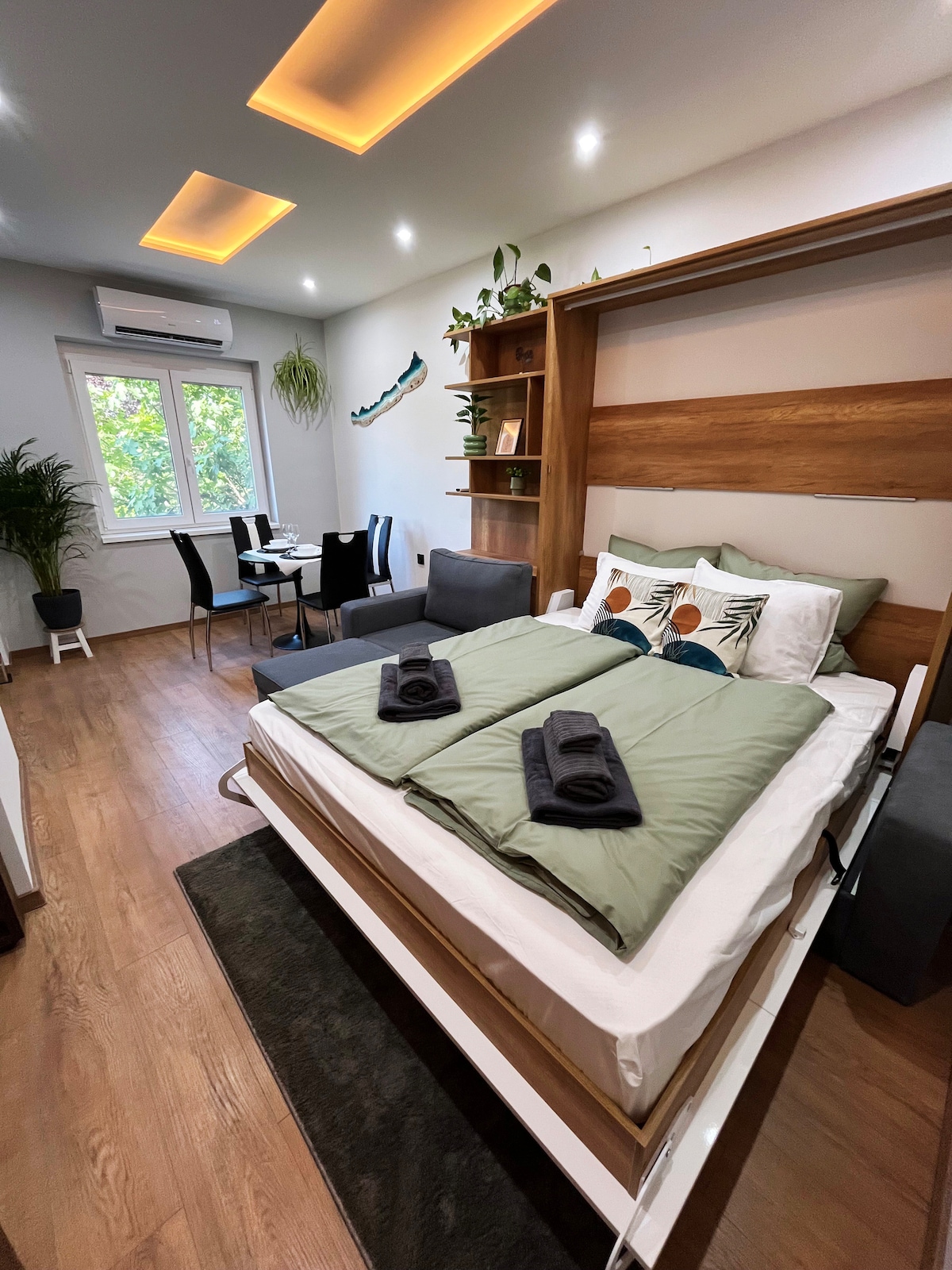Descubra o máximo conforto no vibrante bairro universitário de Veszprem, no contemporâneo V City Studios. Explore o bairro com facilidade: lojas, cafés e mercearias nas proximidades. Estacionamento gratuito após as 17:00. Unidades com ar condicionado, Wi-Fi gratuito, uma kitchenette acessível, uma área de estar confortável e uma casa de banho privada. Observação: é um estúdio de dois níveis com uma cama aconchegante de teto baixo. O seu retiro urbano está pronto e à sua espera!