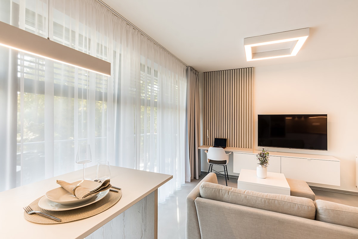 Bem-vindo ao nosso apartamento moderno! Localizado em uma rua tranquila no coração da cidade, ideal para casais, viagens de negócios ou famílias com crianças. O apartamento oferece um quarto com cama de casal, sala de estar com sofá-cama, cozinha totalmente equipada e banheiro moderno. Há Wi-Fi gratuito, TV, máquina de lavar, secadora e estacionamento. Perto de atrações turísticas, restaurantes e transporte público. Check-in e check-out rápidos e sem contato, animais de estimação são permitidos. Venha desfrutar de conforto e estilo!