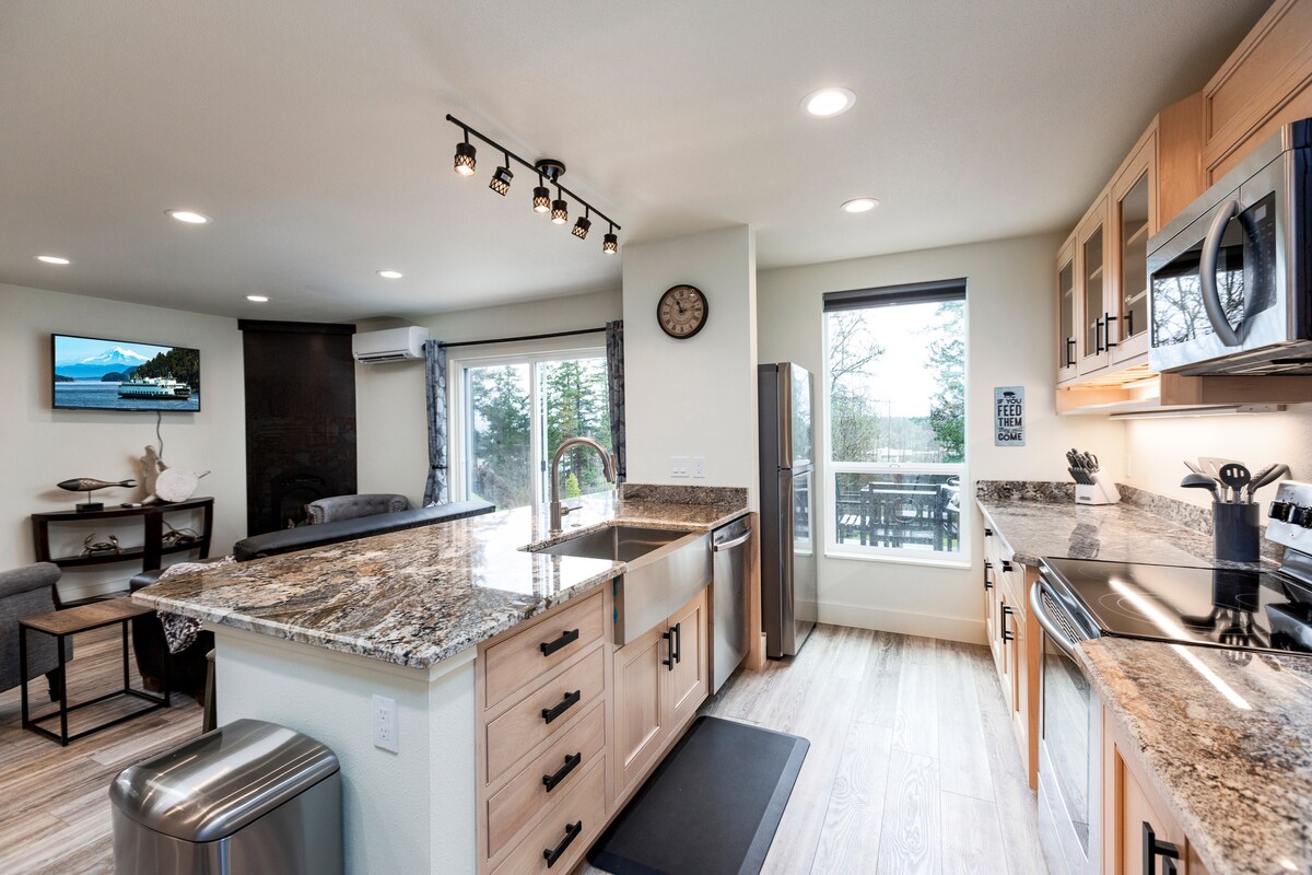 Uma doce unidade de dois quartos recém-construída no coração de Friday Harbor. A poucos minutos do ferry, restaurantes, lojas, aeroporto, hospital e todas as comodidades da cidade. Possui uma lareira elétrica, bancadas de granito, novos eletrodomésticos de aço inoxidável, sofá-cama, máquina de lavar e secar roupa e um belo deck novo para desfrutar da sua vista de Friday Harbor. Conveniência, conforto e facilidade!