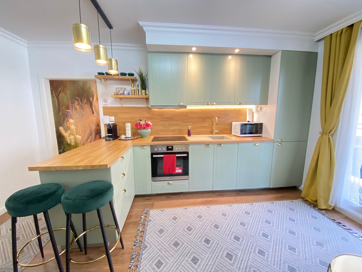 O apartamento é recém-renovado, totalmente mobiliado e adequado para 6 pessoas. Há um quarto e uma sala de estar com TV de tela plana. Você também encontrará uma cozinha com fogão elétrico, máquina de lavar louça, geladeira e freezer, microondas, cafeteira, chaleira e vários utensílios de cozinha. O banheiro também tem um secador de cabelo. Roupa de cama, toalhas de mão e toalhas de banho também estão disponíveis durante o período da sua estadia. O tamanho do apartamento é de 100m².
