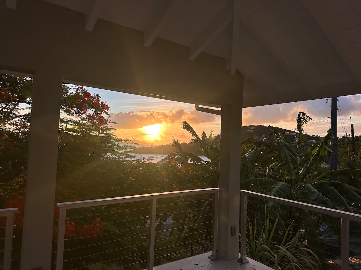 Linda casa de campo com 180 graus de vista para as águas brancas. Você pode ver e ouvir as ondas quebrando abaixo. Ar condicionado, privativo, romântico com um lindo chuveiro ao ar livre. Colher em um ninho de intimidade. Mergulhe nas brisas da ilha. Aprecie as vistas do sol nascente e da lua enquanto eles brilham nas águas cristalinas de Hurricane Hole. Entre no ritmo da vida na ilha com energia solar e água da chuva purificada, recomendações engenhosas, conselhos e dicas privilegiadas. Bem-vindo à elegância simples.