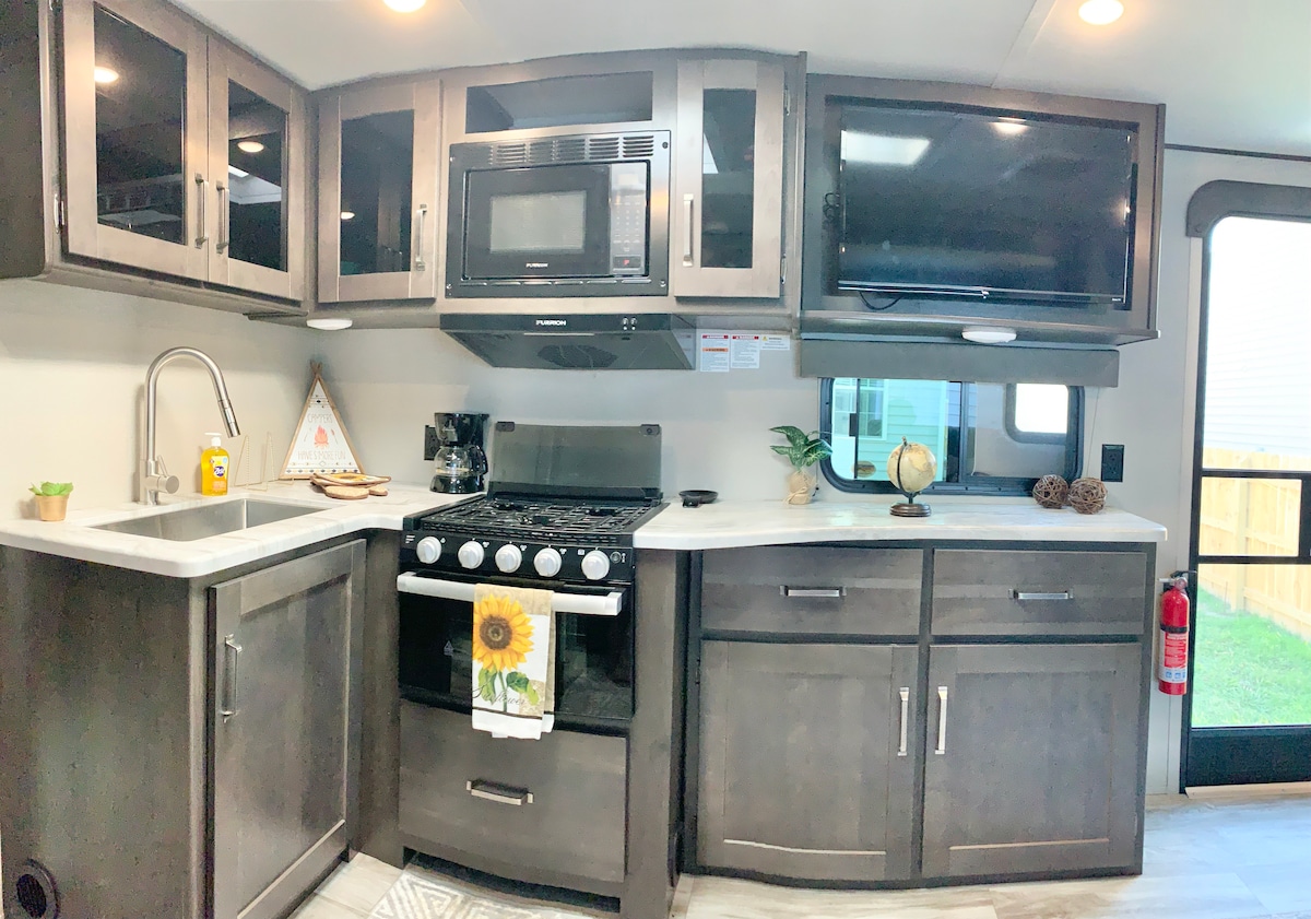 RV luxuoso com planta aberta e elegante, incluindo uma cozinha moderna e uma banheira completa! Quarto principal Queen, 2 beliches completos, sofá-cama twin size. Inclui duas TVs, utensílios de cozinha e roupas de cama para locatários, então, não precisa se preocupar em levar bagagem extra e volumosa. Este trailer tem um chuveiro externo, cozinha, alto-falantes ao ar livre, inclui duas cadeiras e um toldo sombreado. Os hóspedes devem reservar e pagar pelo local do acampamento ANTES DE reservar o trailer. Venha desfrutar deste oásis incrível durante umas férias inesquecíveis!