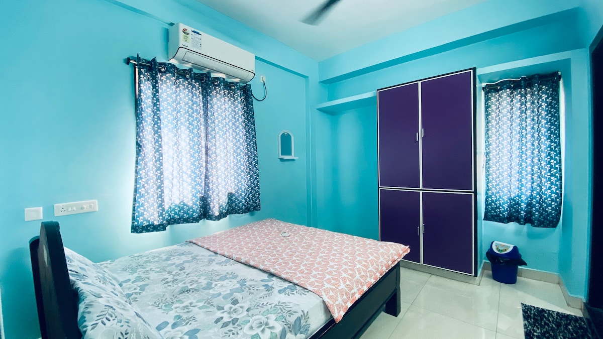 Para Consultas @@ ** Casais solteiros não permitidos ** Este é um apartamento acolhedor de 200 pés quadrados 1BHK localizado no rés-do-chão. Está localizado na zona mais central de Vizag. A uma curta distância a pé do complexo de autocarros, dos centros comerciais, do cinema, dos restaurantes e da CMR Central. Fornecemos uma cozinha totalmente equipada, um quarto com ar condicionado e uma pequena área de desenho com uma secretária. É mais adequado para famílias com crianças/bebés, viagens de negócios e estudantes que precisam de estadias curtas.