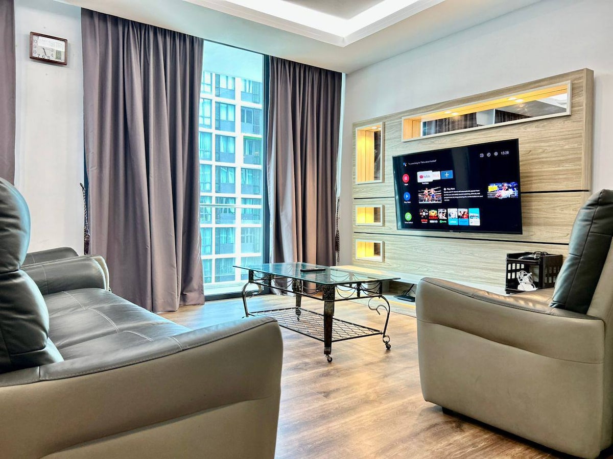 Damos-lhe as boas-vindas à nossa moderna e luxuosa casa de família, concebida por um designer de interiores local! A nossa unidade está no Vivacity Megamall Jazz Suite 4, mesmo por cima do maior centro comercial de Kuching. Estamos no 13.º andar com excelentes vistas da cidade. O Vivacity Megamall tem 4 andares de lojas, restaurantes e entretenimento. O nosso espaço tem 2 quartos e 1 casa de banho, perfeito para até 5 pessoas confortavelmente. É perfeito para um casal, família pequena ou viagens de negócios. Serão preparadas comodidades básicas e toalhas.