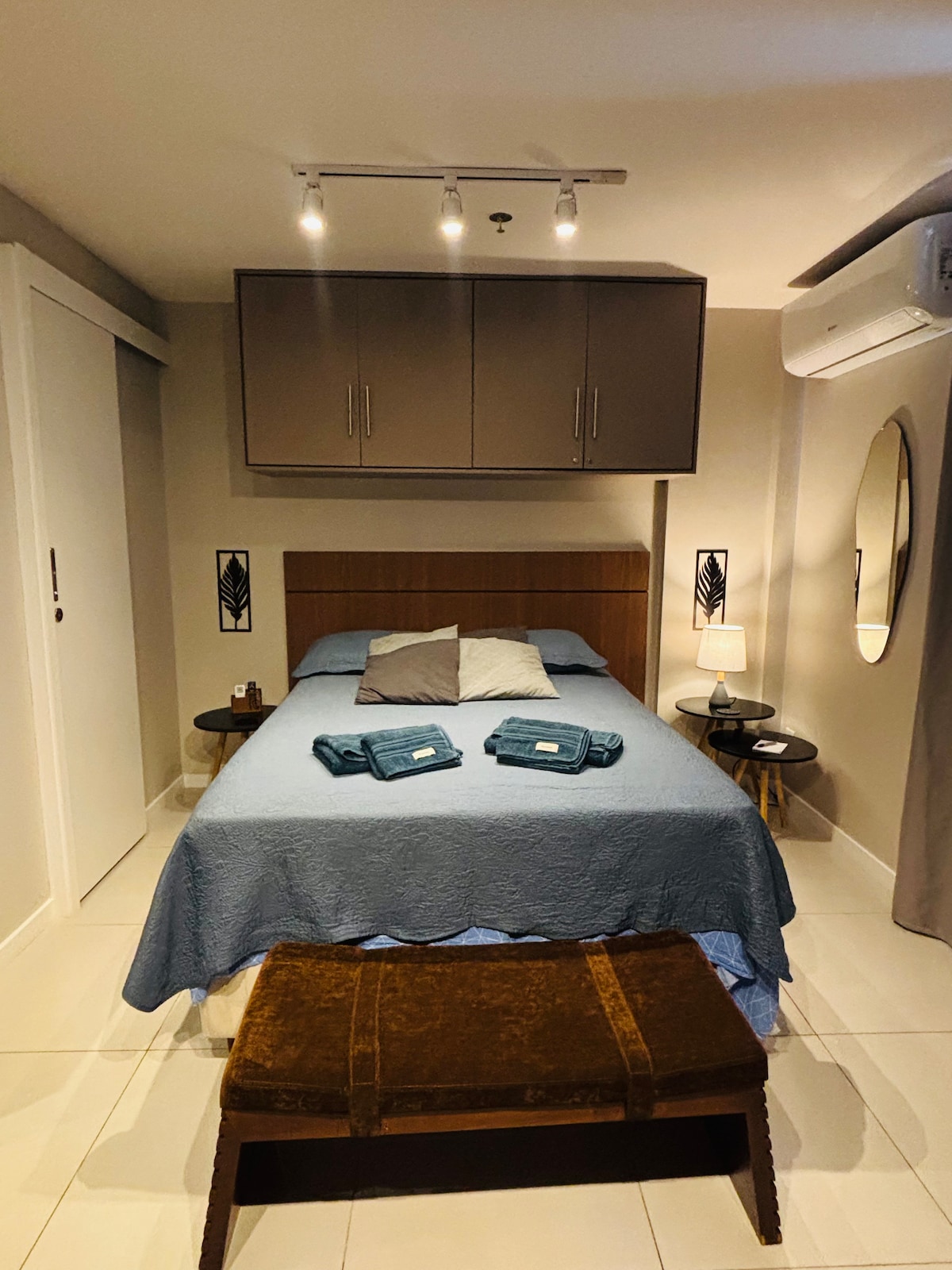 Flat novo em área nobre, moderno e completo. Acesso fácil para deficientes físicos. Possui ar-condicionado, black-out na janela, Wi-Fi e espaço de trabalho. Cozinha equipada : geladeira, micro-ondas, cafeteira, eletrodomésticos e fogão por indução. Roupa de cama, ferro de passar e lavanderia no prédio (uso pago). TV com canais fechados. Prédio com câmeras de segurança, detector de fumaça, elevador e estacionamento gratuito na rua. Ideal para quem busca conforto, praticidade e ótima localização.