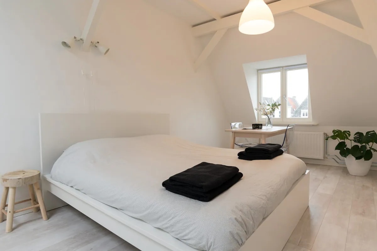 Este sótão acolhedor e iluminado está localizado no coração de Leiden, a 50 metros da prefeitura, e oferece vista para o charmoso Botermarkt, localizado em um dos melhores canais de Leiden. O quarto espaçoso e original tem uma cama de casal maravilhosa e uma área de estar confortável e espaçosa com sofá-cama.