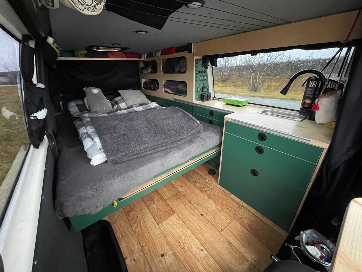 VW Transporter T4 com edifício residencial que proporciona um espaço confortável para duas pessoas dormirem. A caravana será estacionada nas proximidades, num local tranquilo à sua escolha, com bom acesso ao centro e a outras partes da cidade. O carro está equipado com: - cama 140x200cm - aquecimento independente - Wi-Fi - água corrente com possibilidade de chuveiro exterior quente - armazenamento - mesas para trabalho - A cama pode ser dobrada no sofá - frigorífico - gavetas - balanças retráteis com fogão e equipamento de cozinha