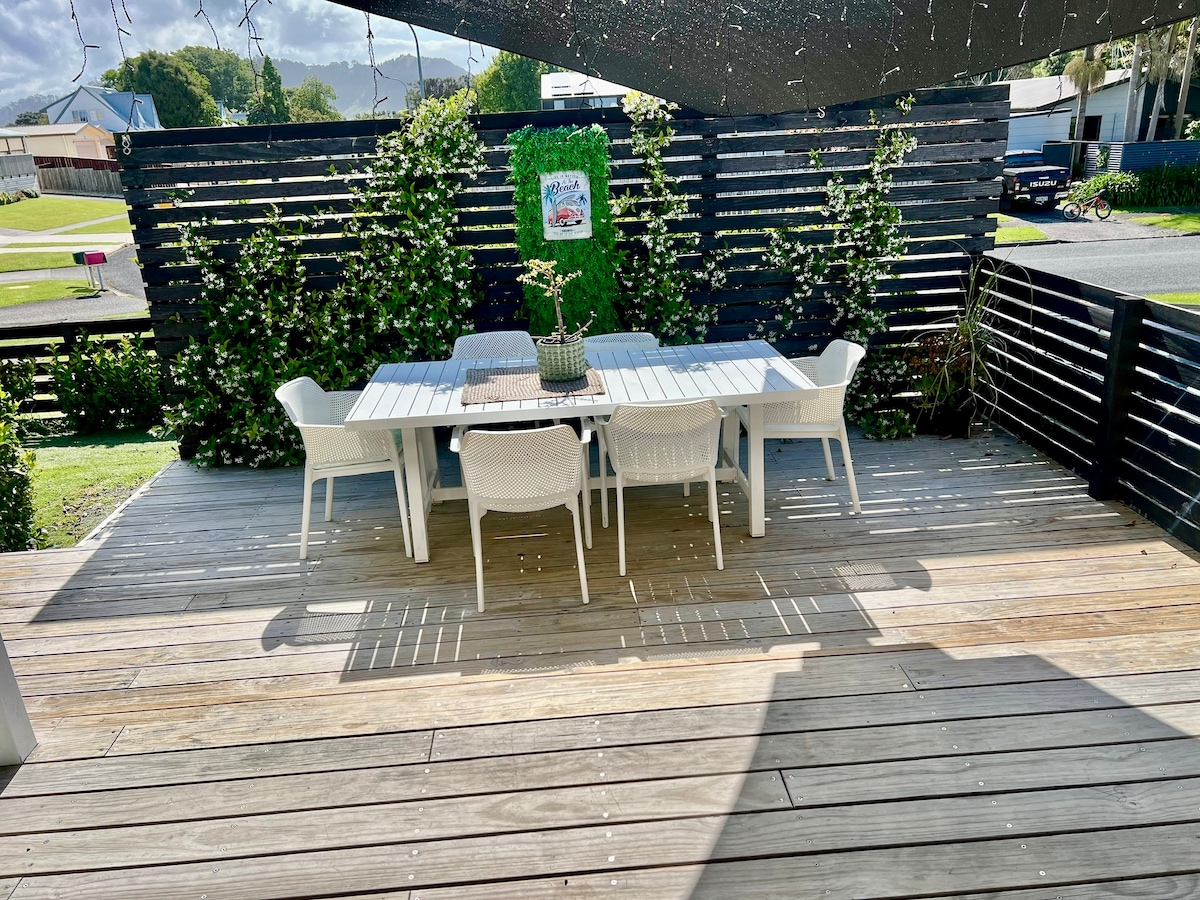 Fabulous on Thames coast. Stylish, well appointed 1 bedroom cottage, open plan living, dining, kitchen with direct access to lovely outdoor relaxation areas. A quiet haven off the main road, only 100 mtrs easy walk to beach reserve and fishing. Enjoy the birdsong, sunrise and daytime hours in the shady, tropical garden at the rear of the house with its generous outdoor seating and dining facilities, and take in the sunset from the deck and coastal garden in the front of the house.
