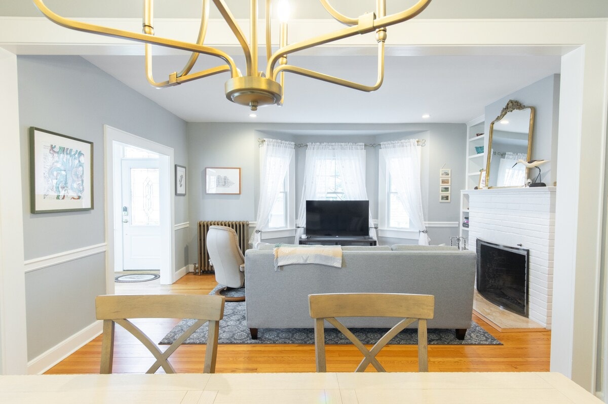 Espaçoso Colonial 4BR/3 Banheira no coração do centro de Red Bank. Convenientemente localizado a uma curta distância a pé da estação ferroviária, Molly Pitcher, Oyster Point e dos melhores restaurantes e bares. 9 Hóspedes. Cozinha completa aberta para a sala de jantar e área de bar. Churrasqueira exterior, lareira exterior e área de estar. 1º andar: 1 quarto, casa de banho completa, sala de estar, sala de estar com sofá-cama com gaveta, cozinha, sala de jantar, lavandaria. 2º andar: 2 quartos com camas queen. 1 BR c/beliches individuais. 2 casas de banho completas. Wi-Fi rápido Fios e cabo. Alpendre da frente e quintal.