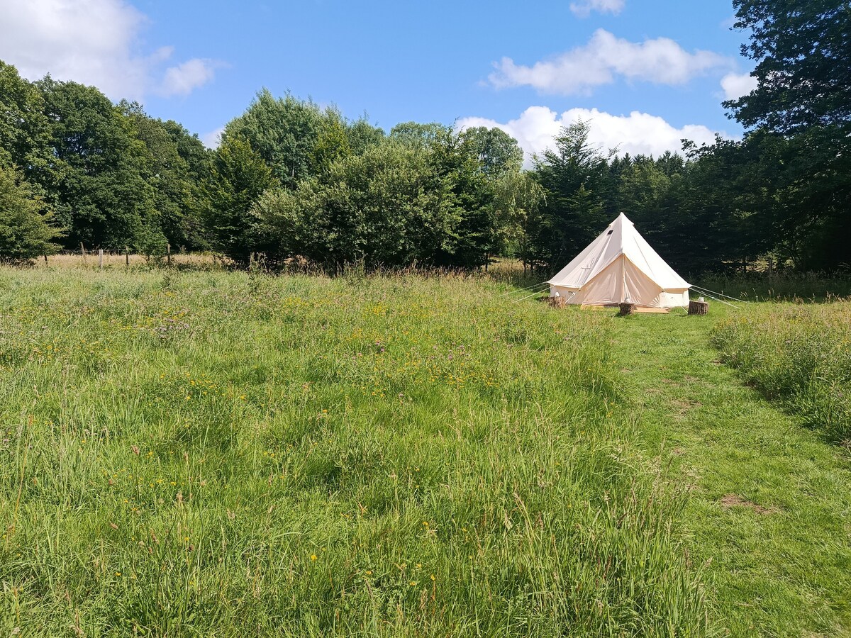 Tenda empoleirada simplesmente mobilada (mesa ext, 2 cadeiras e cama 1m40 com lençóis e edredão, sem equipamento de cozinha na tenda) com uma vista muito agradável sobre a aldeia e a floresta. As ovelhas andam no campo e vêm acordá-lo... Sanita e chuveiro na casa (50 metros), churrasqueira ou fogueira disponíveis (se demasiado seco, apenas churrasco, madeira/churrasco extra). Aldeia com açougue, Bouillon a 8 km. Belas caminhadas, caiaque, natação no rio. Pequeno-almoço com suplemento.