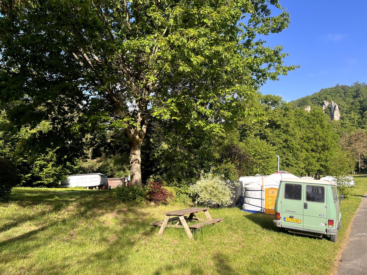O yurt está situado no espaçoso parque de campismo Villatoile, rodeado pela natureza. O rio Lesse atravessa o vale, que tem apenas uma pequena estrada com quase nenhum trânsito. O vale está rodeado de rochas, razão pela qual vivo lá no verão e trabalho lá como instrutor de escalada. No belo parque de campismo, pode usar as comodidades, como chuveiros e casas de banho. O preço inclui as taxas de campismo!
