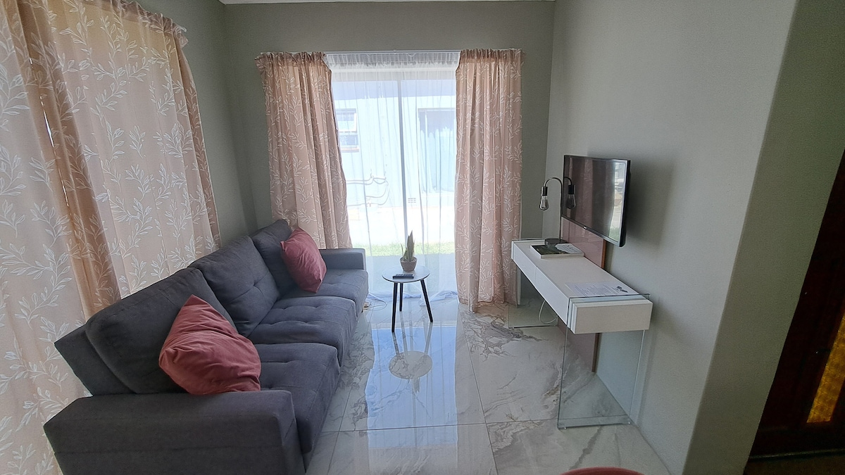 Um apartamento espaçoso, moderno, totalmente mobilado, com um quarto, entrada privativa, um lance de escadas acima. Idealmente situado perto das principais escolas, hospitais, restaurantes, centros comerciais, a uma curta distância de carro de praias deslumbrantes. O sofá de canto de 3,2 m x 2,3 m pode acomodar confortavelmente uma criança mais velha. Para crianças pequenas, pode ser colocado um colchão no chão. Há uma televisão de ecrã plano com Netflix e excelente Wi-Fi! Apenas hóspedes registados podem utilizar o apartamento. Infelizmente, a piscina é apenas para uso privado.