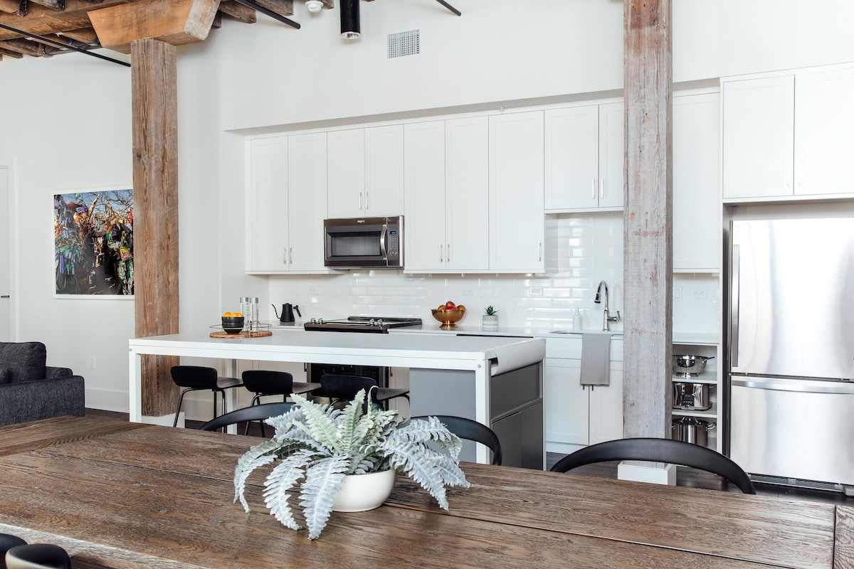 ⭑ Bem-vindo ao The Pontchartrain⭑. Esta elegante suite de dois quartos e duas casas de banho apresenta tijolos expostos, vigas de madeira originais e uma espaçosa área exterior privada, combinando o charme de Nova Orleães com o conforto de luxo. Perfeito para casais, amigos ou pequenos grupos, o The Pontchartrain inclui uma cozinha totalmente equipada, refeições internas para seis pessoas e uma área de estar luminosa no coração do Warehouse District. A poucos passos do Bairro Francês, é a base perfeita para explorar a cidade.