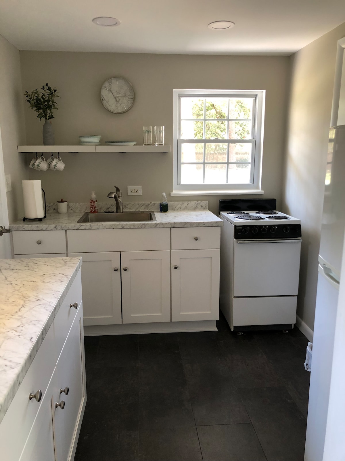 Apartamento estúdio iluminado e charmoso de 408 pés quadrados com uma cama queen size, escrivaninha, espreguiçadeira/otomana, banheiro privativo de 3 peças e cozinha acoplada (pia, frigobar e micro-ondas). Também inclui um armário dedicado, estação de café bem abastecida, TV smart, porta-malas, tábua de passar roupa de tamanho completo e secador de cabelo. Janelas e portas francesas oferecem cortinas romanas com painéis blackout para privacidade. O acesso a uma área de estar ao ar livre também está incluído. Conveniente para atrações locais em Aiken, SC e Augusta, GA.