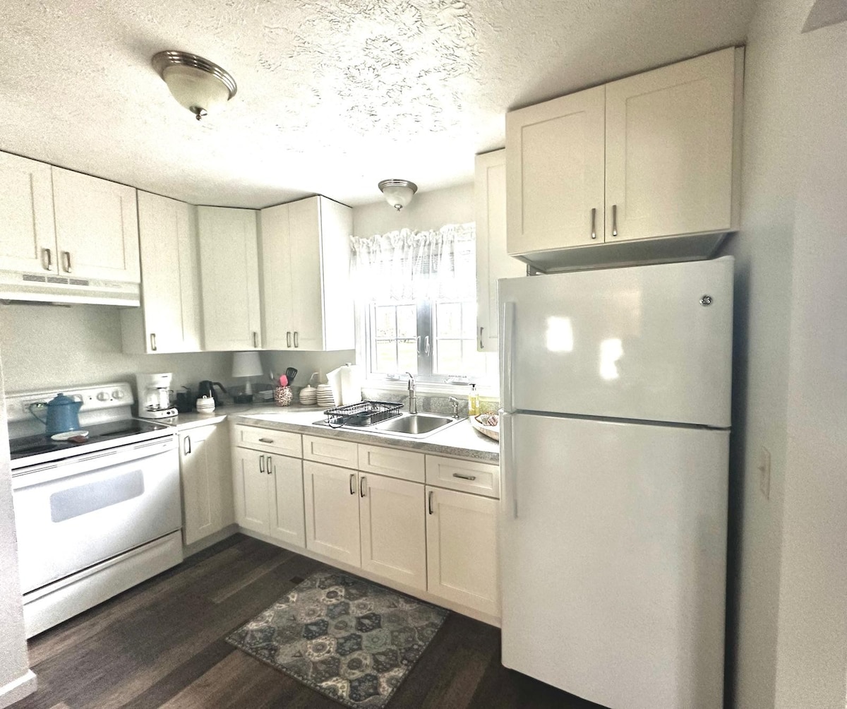 "Descanse um pouco". Desfrute da nossa suíte privada para hóspedes que apresenta uma grande área de estar principal onde a cozinha e a área de jantar também estão localizadas, um quarto separado e banheiro privativo. Esta suíte está localizada no nível inferior do nosso rancho elevado e requer a capacidade de usar seis degraus. Faça check-in sozinho na entrada da frente privada com teclado numérico. Vaga de estacionamento na garagem com passarela iluminada pavimentada até a entrada.