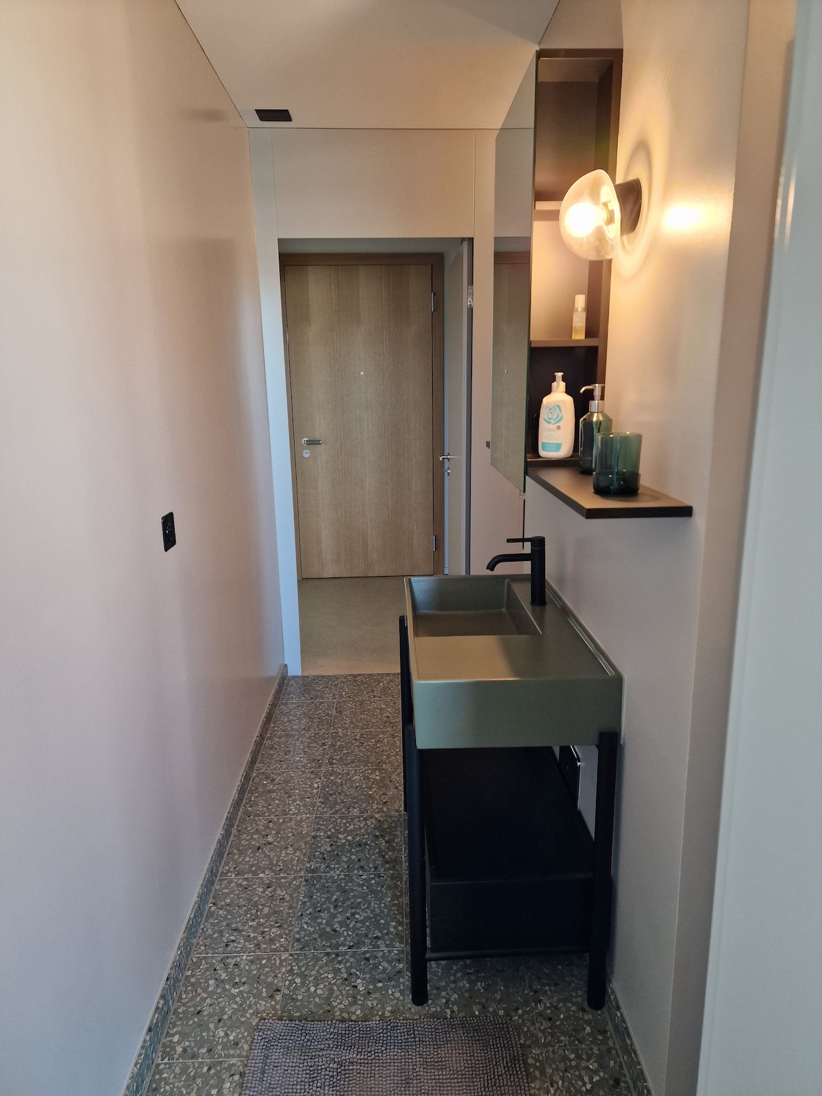 Estúdio moderno e individual, com decoração industrial, cozinha, banheiro, cama de casal e entrada privativa. O apartamento está localizado no térreo de uma casa de fazenda, que nós mesmos ampliamos parcialmente. Como o resto da casa, nós o equipamos com alguns elementos de design de nossa própria concepção. A área de estar privativa com sol da tarde e o riacho convida a relaxar e o caminho para o rio Emme passa diretamente em frente ao apartamento.