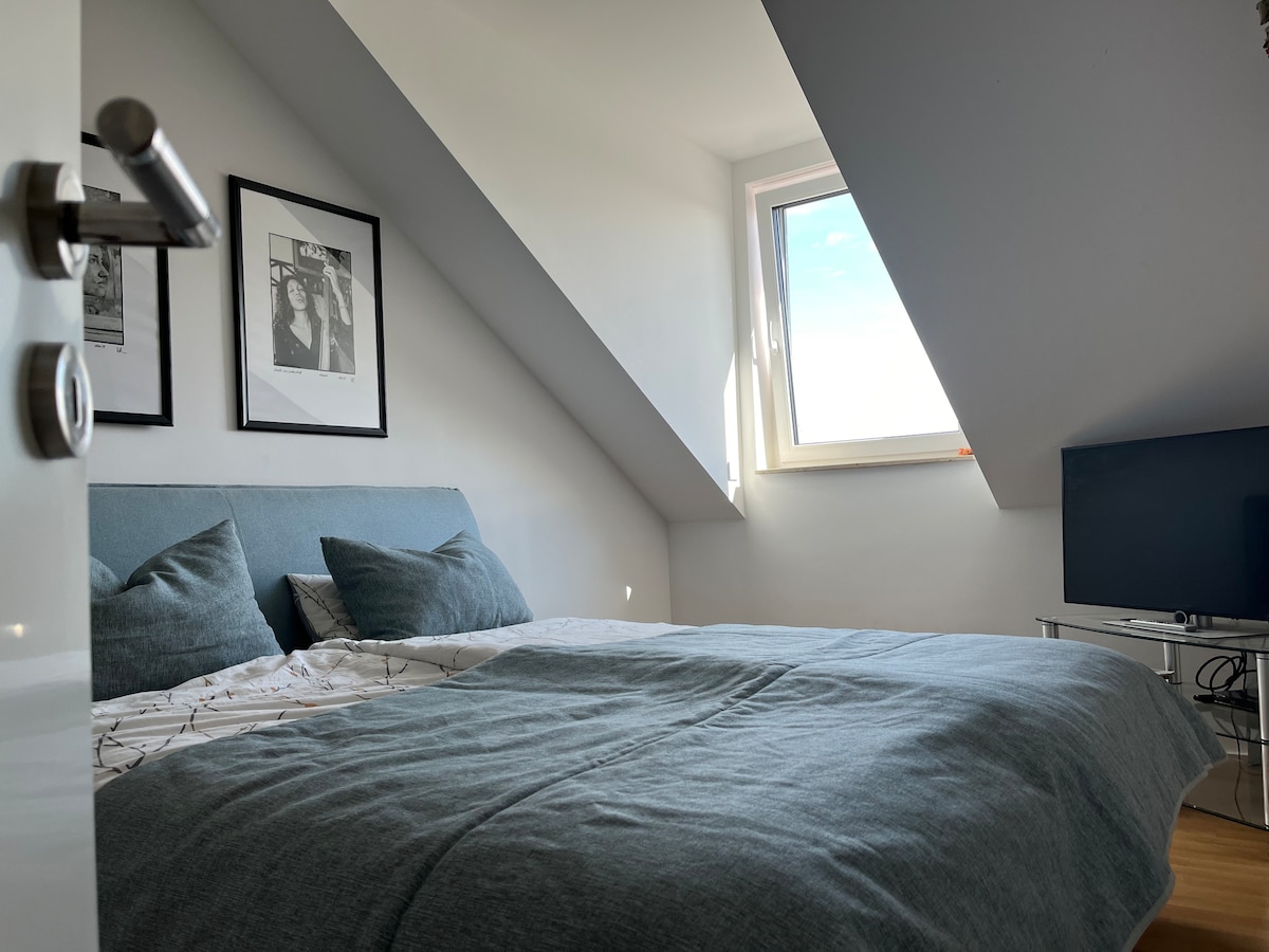 Apartamento no último andar a 20 minutos de carro de Potsdam e Berlim e a 30 minutos de trem do aeroporto de BER. Cozinha de design espaçosa e totalmente equipada*, banheiro com banheira Agape Vieques e pia correspondente*, quarto com cama de 2,70 m*, sala de fitness pode ser usada como uma segunda área de dormir. Aqui está uma cama de casal de 1,80m*Beamer com pré-instalação de aplicativo para NETFLIX, Disney + e Amazon Prime Login, brinquedos, supermercado com padaria e açougue, mercado de bebidas*Lagos e caminhadas