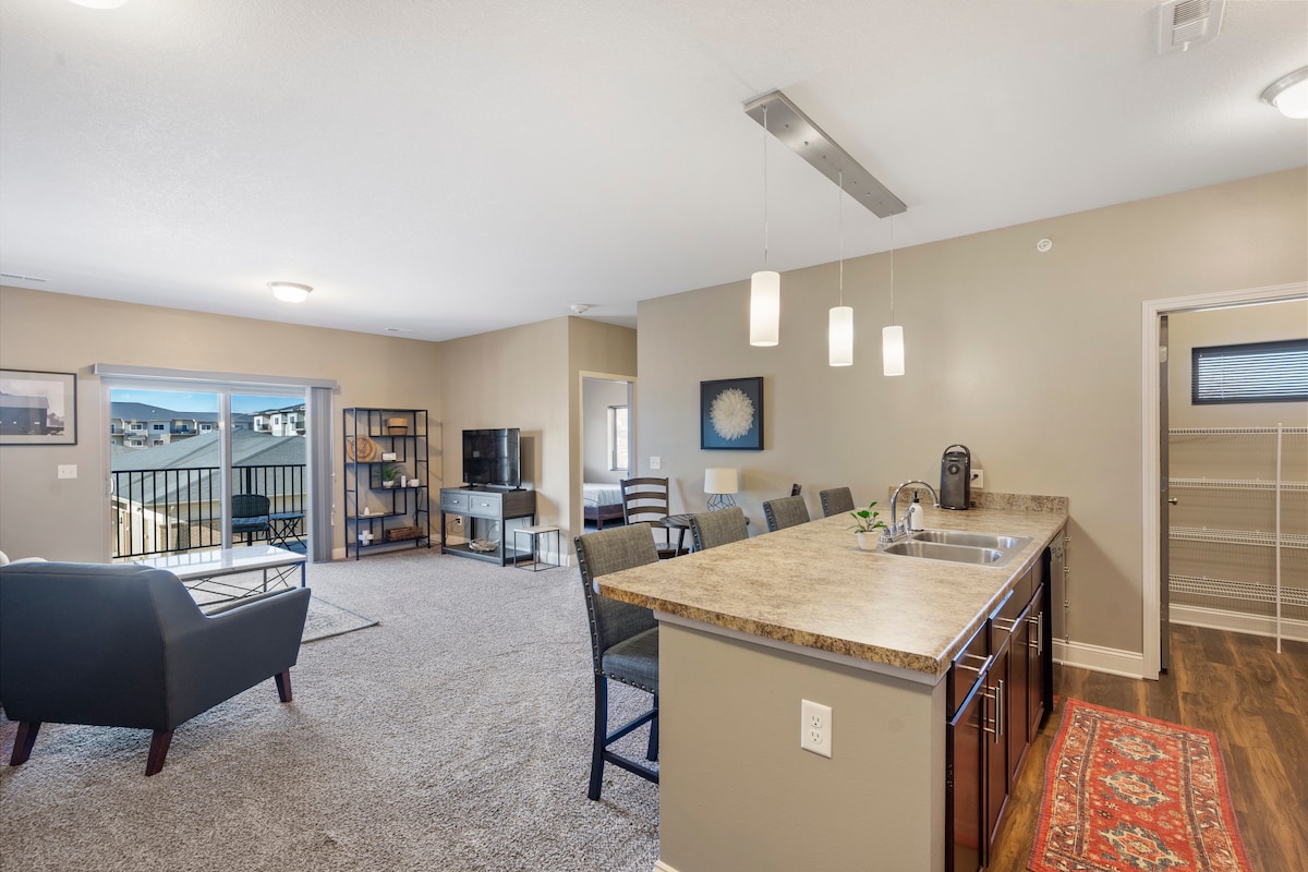 4/20/26: New Carpet! This 2BR/2BA end unit is full of natural light. A perfect place for business, or family travelers. This spacious design will leave you plenty of room to breathe. Featuring an oversized island, full size laundry, king bed, 2 full beds and a spacious living room. Come enjoy your next home away from home and lets us do the rest. This unit also comes with a one car garage and multiple parking lot spaces, high speed WiFi w/complimentary YouTube TV, and chef ready kitchens.