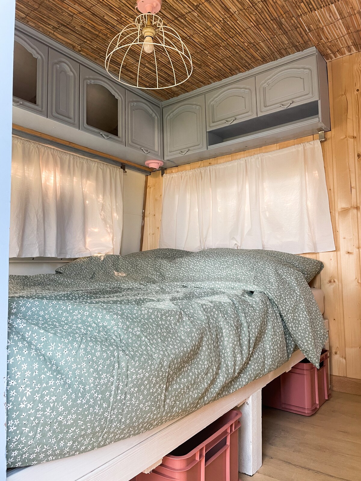 Bem-vindo a uma das nossas caravanas com decorações artesanais! Acorde na natureza e desfrute de uma sessão de ioga matinal ou café no nosso terraço de madeira com vista para o lago. Estamos baseados num acampamento junto ao lago "Resko", a 5 minutos a pé da costa. A sua caravana está equipada com um frigorífico. Existem 2 camas de casal e 2 camas individuais. As casas de banho são partilhadas com o resto da nossa comunidade de acampamentos. Há várias casas de banho e chuveiros. Esteja à vontade para nos fazer perguntas. Estou ansioso por vê-lo no nosso oásis :)