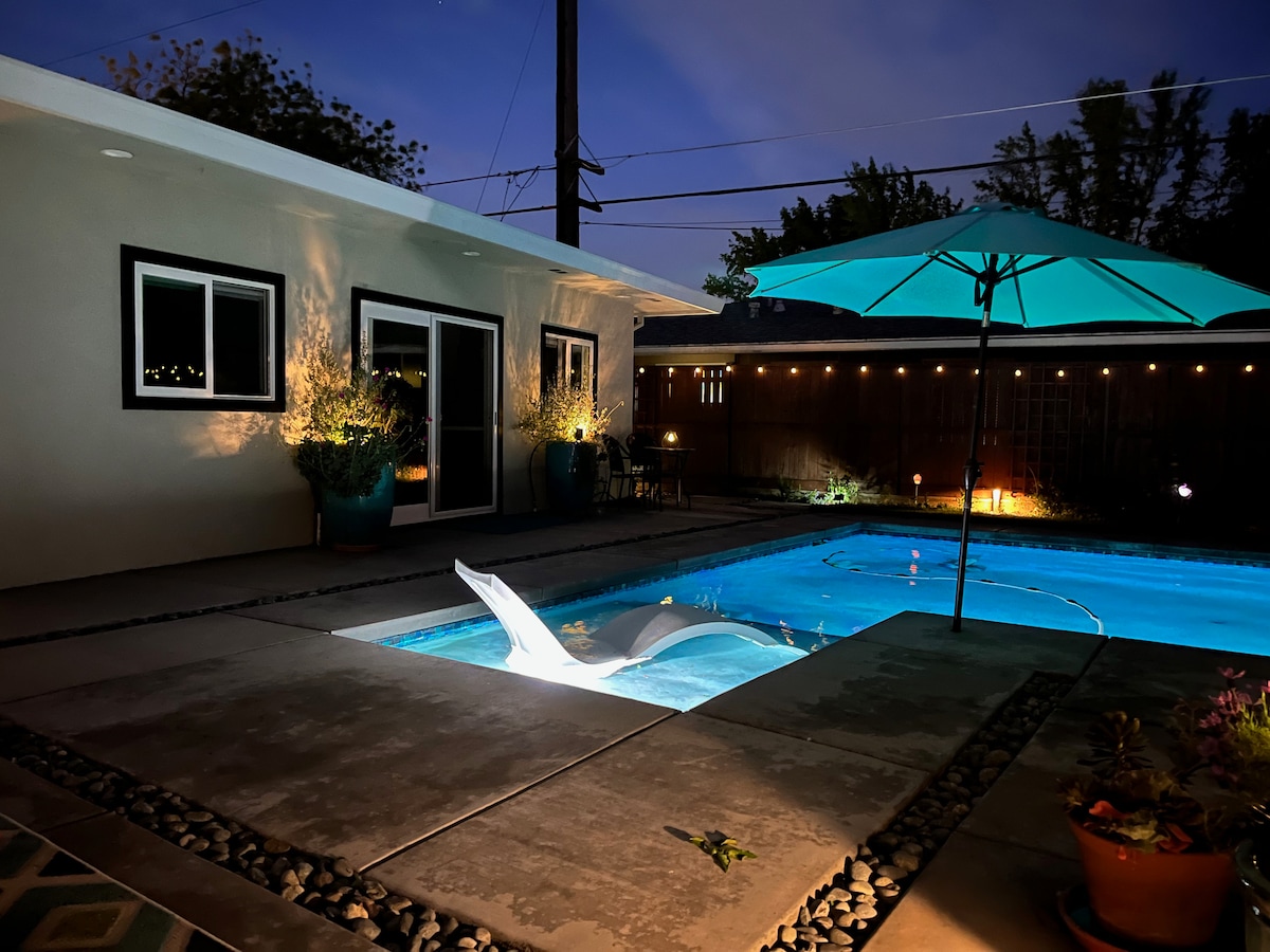 Relaxe e desfrute desta espaçosa casa totalmente equipada longe de casa! Esta casa de estúdio de garagem convertida de 400 pés quadrados tem estacionamento gratuito no local com uma entrada privada. O espaço está mobilado com todos os confortos de casa: uma cozinha totalmente equipada, máquina de café, torradeira, máquina de lavar e secar roupa empilháveis, uma bela casa de banho com dois lavatórios e um lindo chuveiro, uma pequena área de secretária, um armário completo, uma cama king size e uma parede com design iluminado! A poucos minutos do centro de Sacramento e Davis.
