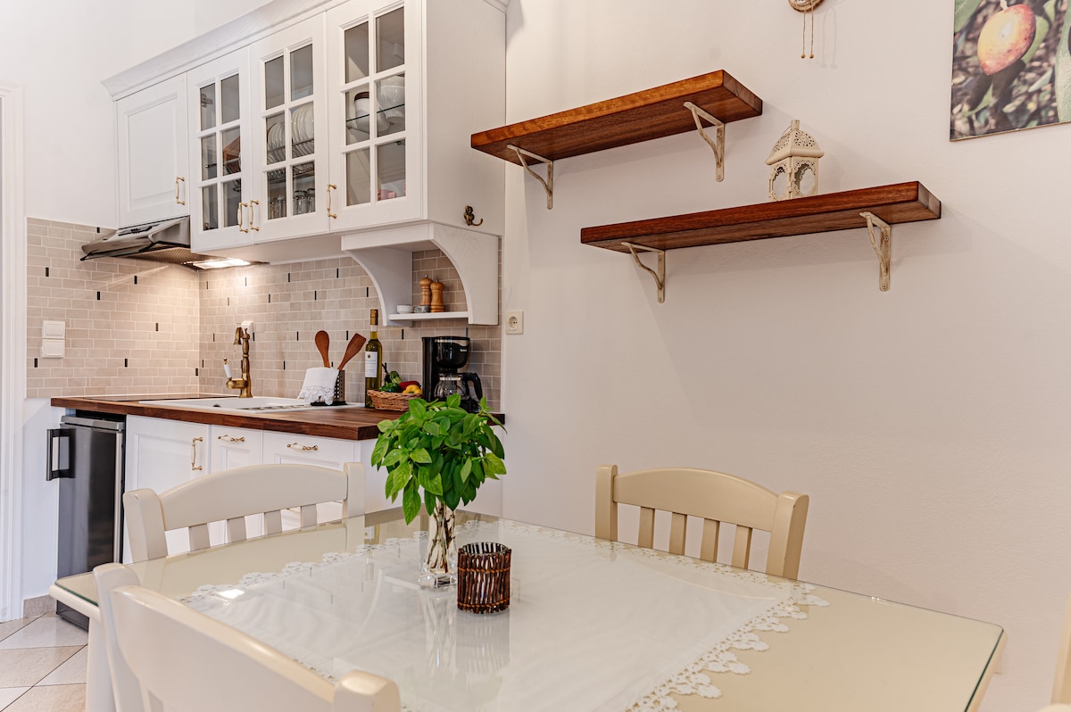 Apartamento tranquilo a poucos metros do centro de Olímpia e perto do sítio arqueológico, a uma curta distância a pé. Três quartos principais, cada um com banheiro interno, área comum com sofá-cama e banheiro separado. Varanda, terraço e pátio ao redor do apartamento em contato com o jardim. Estacionamento confortável na rua em frente ao apartamento. Cozinha totalmente equipada para preparar refeições.