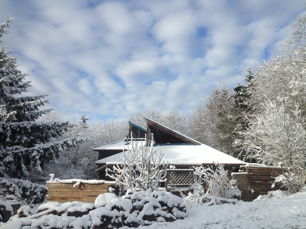 The spacious open floor plan and vaulted ceiling, designed by architect Dennis Norman, makes this place one of a kind! Bordering the forest at the end of the road you are in a secluded oasis located at the top of the hill above Manzanita. With skylights, fabulous kitchen, big wood stove, and cozy bedroom loft, hear the distant surf and the rain on the roof as you wake up or doze off . Yet only minutes away from Manzanita and the beach.