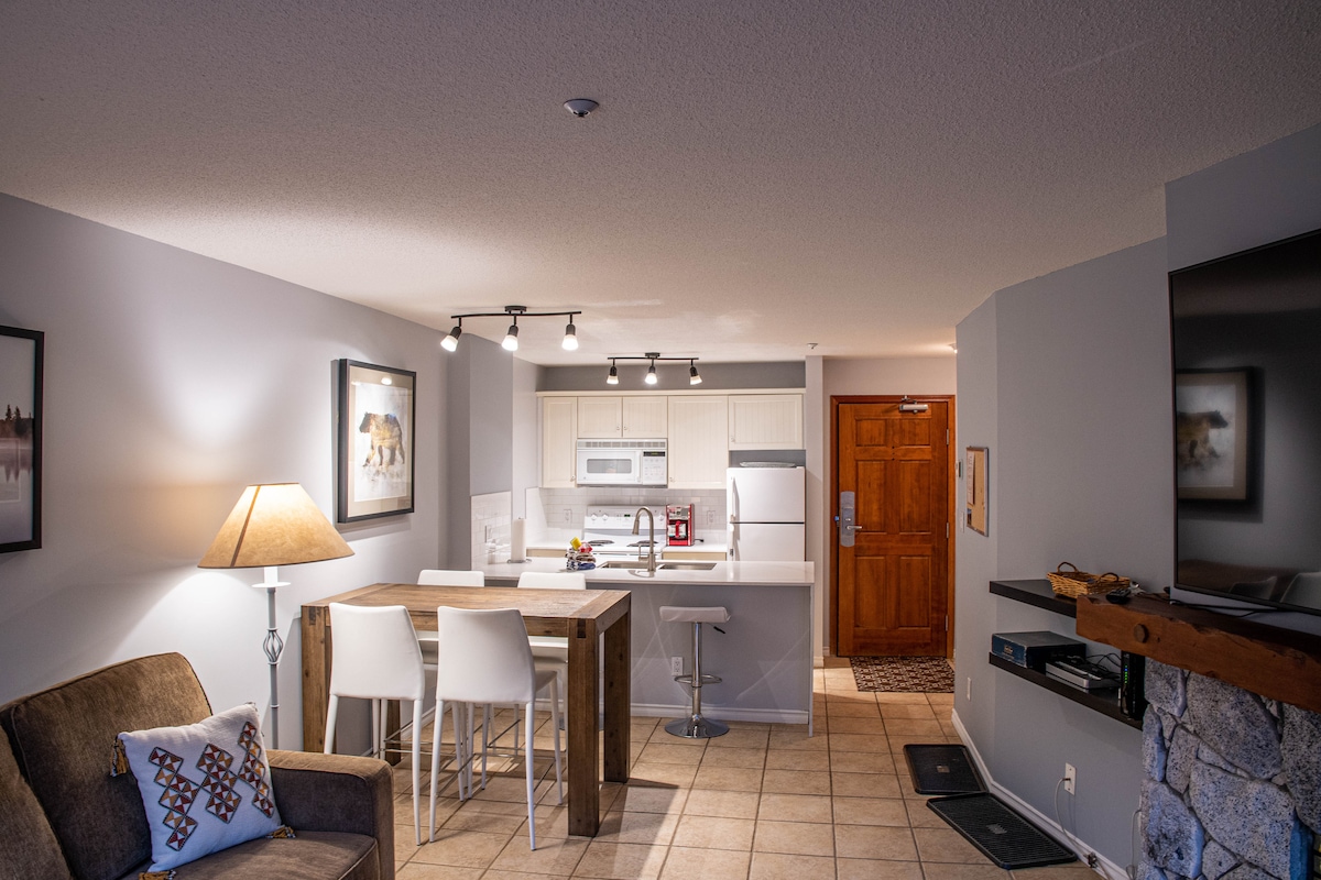 Bem-vindo ao seu oásis na montanha. A 1 minuto a pé do teleférico Blackcomb! O nosso condomínio moderno é um quarto luminoso e espaçoso com janelas envolventes para vistas perfeitas e arborizadas. Procure pela montanha Whistler enquanto saboreia café da sua mesa de cozinha! A suíte tem tudo: - cama king - sofá-cama - cozinha completa - banheira de hidromassagem - Keurig - Alto-falante Bose - Ar condicionado central - atualizado em julho de 2025 O edifício dispõe de um ginásio, lavandaria, piscina e banheira de hidromassagem exterior.
