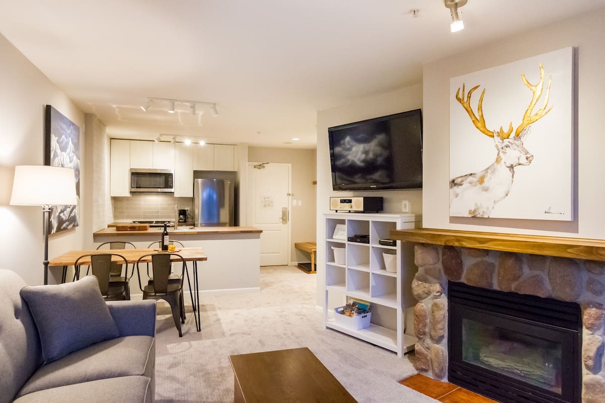 Escapadela de inverno: esqui, spa e relaxamento em Whistler Apartamento acolhedor no rés-do-chão a apenas 5 minutos a pé da Montanha Blackcomb. Perfeito para estadias na época de esqui. Desfrute de acesso fácil ao ginásio, à banheira de hidromassagem, à sauna e à sala de armazenamento de esqui. 🔥 Relaxe junto à lareira após um dia nas pistas 🍳 Cozinha totalmente equipada. 🧖♀️ Spas e centros de bem-estar nas proximidades 🚶♀️ A uma curta caminhada do Fairmont e de restaurantes locais 🏔️ Ideal para casais ou famílias pequenas