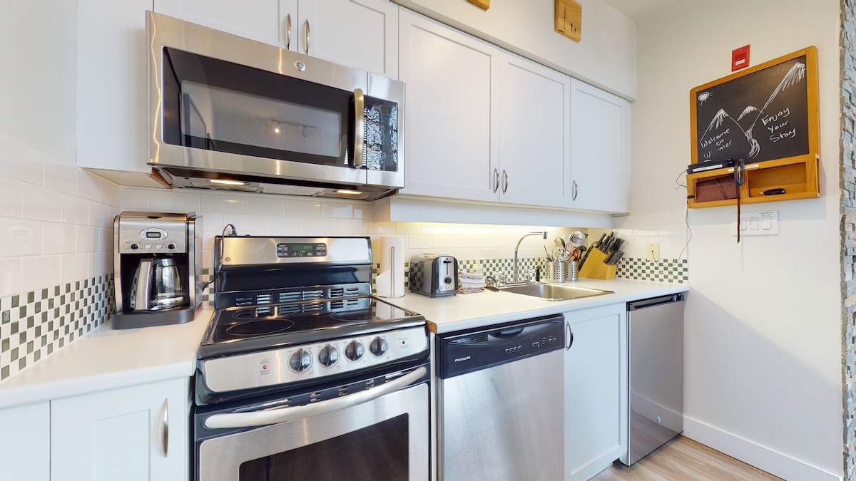 **Este apartamento acabou de ser totalmente renovado**. Este estúdio no último andar é um dos mais agradáveis do edifício, com vistas deslumbrantes para a montanha. Vem com uma cama tamanho queen, cadeira de designer que se transforma em uma cama de solteiro de espuma de memória, Wi-Fi, cabo, ar condicionado central, geladeira completa, lavadora/secadora na suíte e cozinha totalmente abastecida. Uma das melhores piscinas compartilhadas de Whistler, banheiras de hidromassagem, sauna, sala de fitness, bem como armazenamento de esqui/bicicleta para sua conveniência. O Cascade Lodge fica a poucos passos de 2 mercearias e lojas de bebidas.