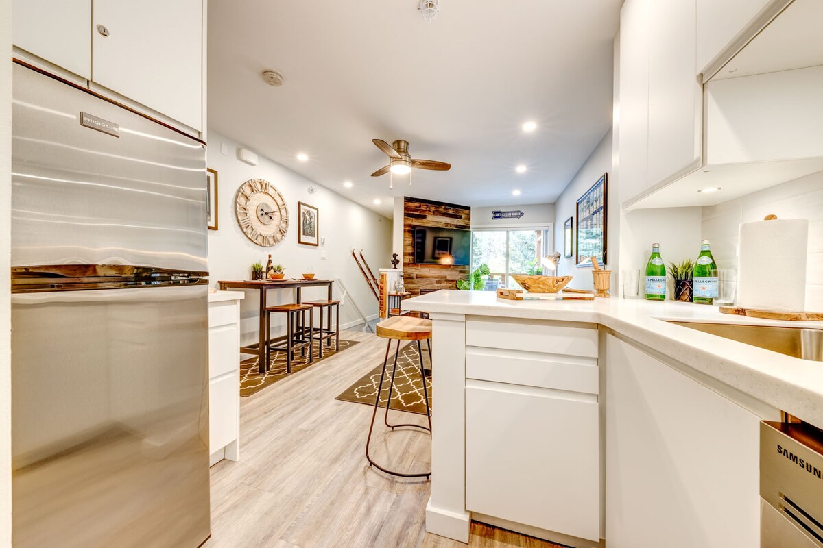 Um quarto renovado com uma banheira de hidromassagem privativa, distribuído por dois andares com dois pátios ensolarados e estacionamento gratuito. Localizado em frente ao passeio da vila de Whistler, você pode estacionar seu carro e caminhar por toda parte. Aproveite a comodidade da mercearia, loja de bebidas, lojas e restaurantes do outro lado da rua enquanto volta para uma casa tranquila e acolhedora. Acesse os elevadores de esqui caminhando cerca de 15 minutos ao longo do passeio da vila ou atravesse a rua para embarcar no ônibus gratuito.