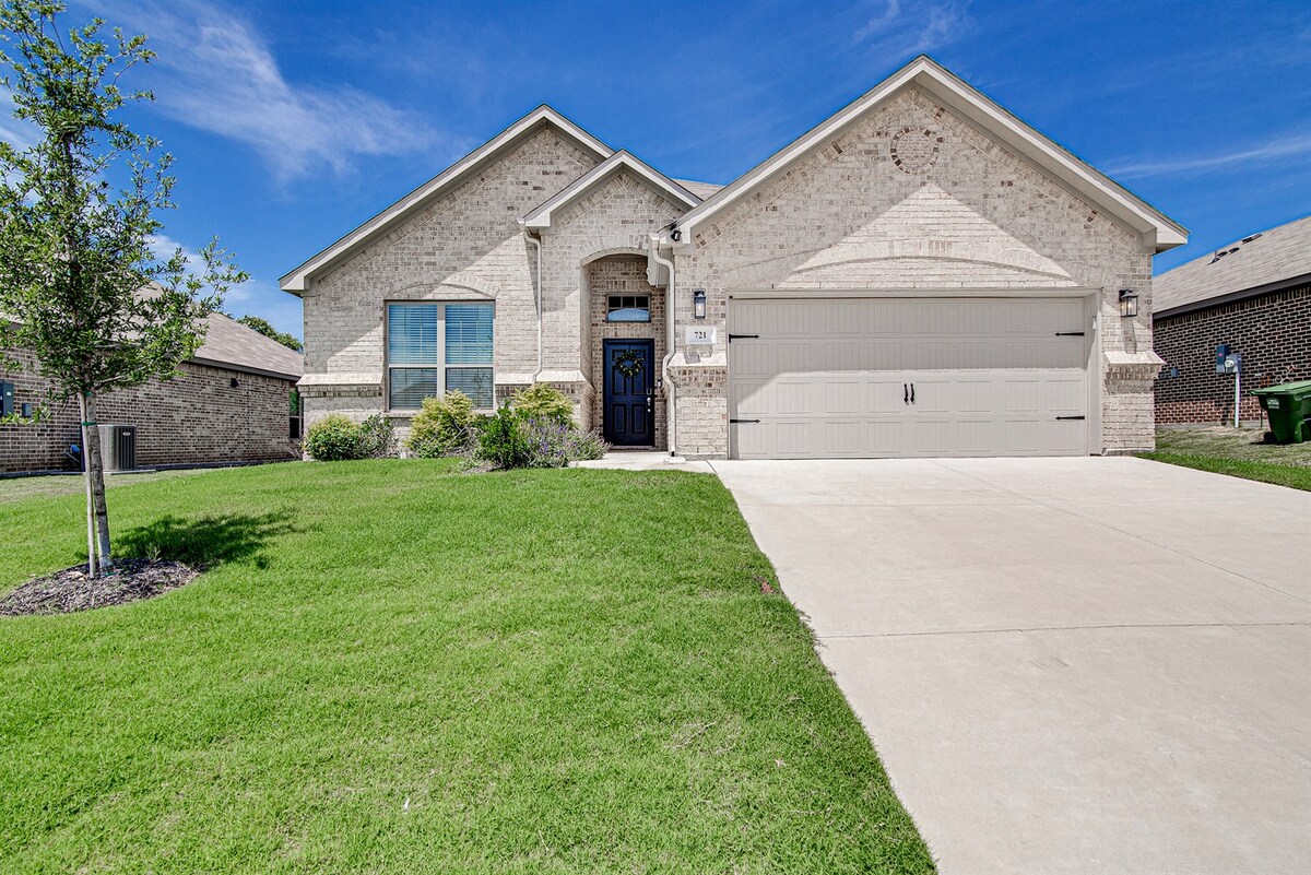 The Eagle House is a welcoming new-build that provides a modern, earthy, luxurious ambiance. The large private house has 3 bedrooms, 3 full bathrooms, private office, patio, and large outdoor grassy area. One mile from Eagle Mountain Lake, guests can enjoy tree-lined trails, tennis courts, boat docks, and waterfront picnic areas all easily accessible and free. Downtown Fort Worth, world-class museums, shopping, dining, and the historical Stockyards are just a little over a 30-minute drive away.